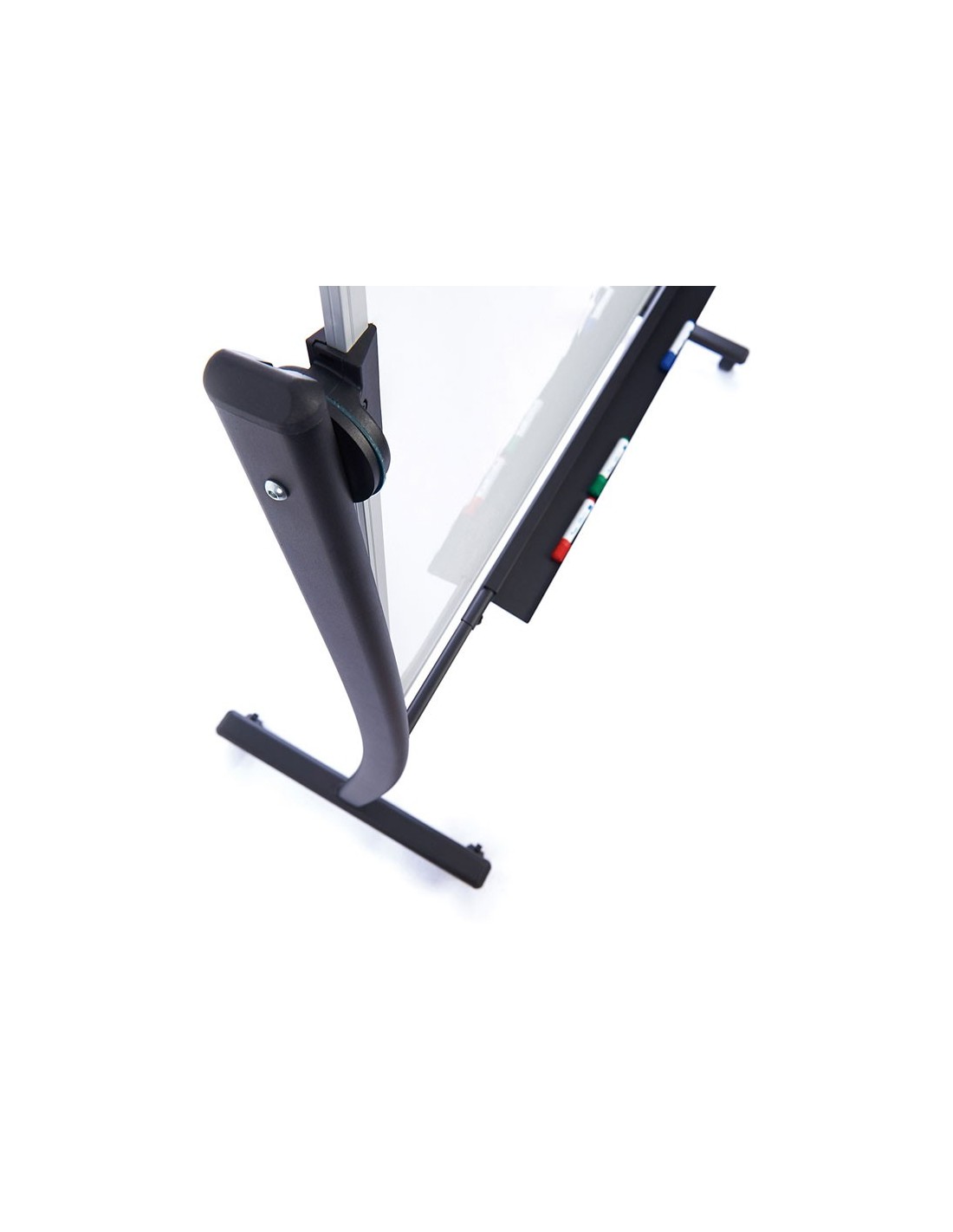 Pizarra móvil volteable de doble cara 120x180 cm. Superficie blanca de acero lacado magnético y marco de aluminio anodizado. Incluye bandeja para rotuladores. Estructura volteable con forma ergonómica curvada de gran diseño. Sistema patentado de rotación que permite el giro y bloqueo de la pizarra sin necesidad de accionar ninguna palanca o pomo, aportando mayor seguridad en el giro y evitando cualquier movimiento de oscilación o vibraciónal escribir. Estructura con ruedas para su desplazamiento. Incluye bandej a para rotuladores.