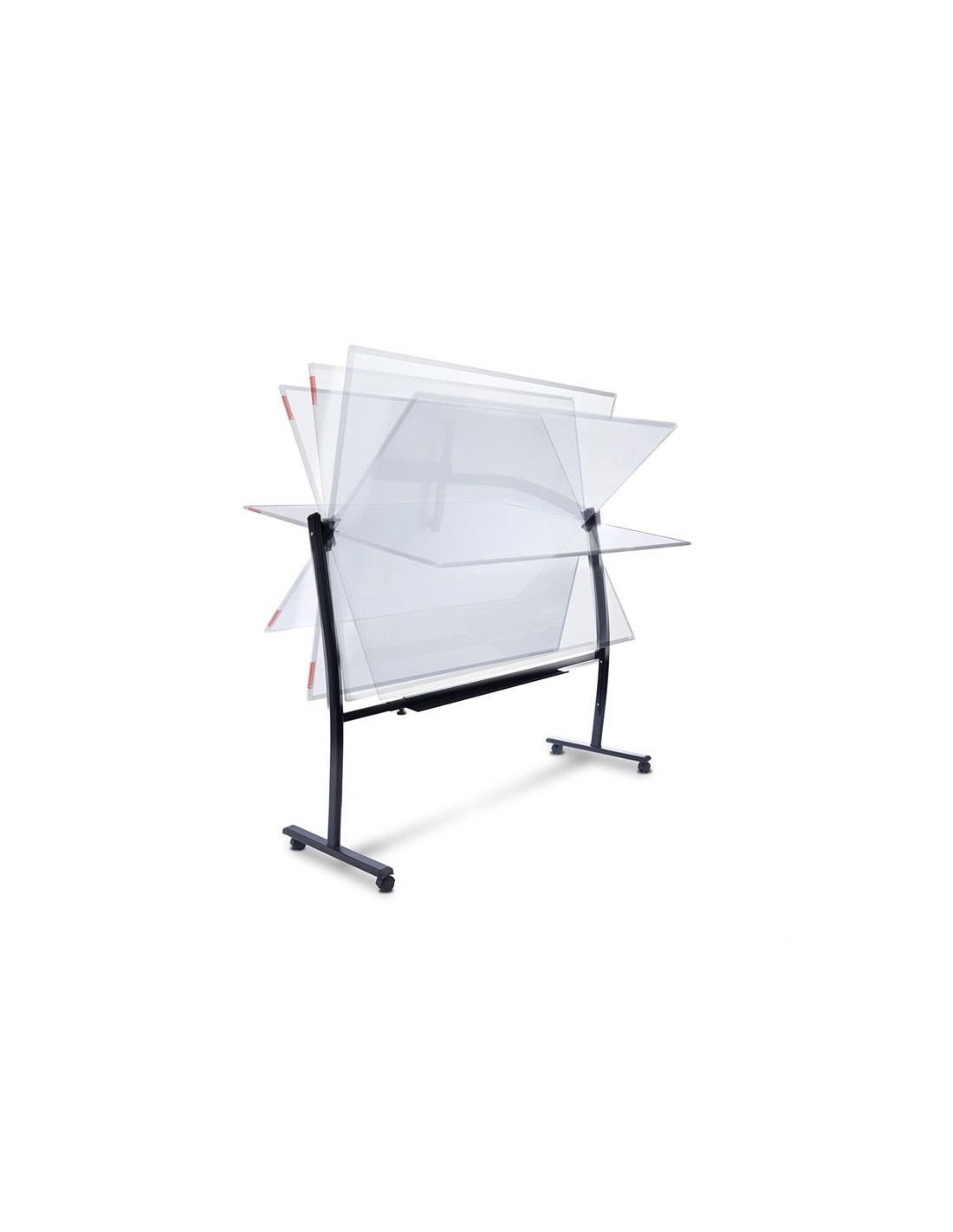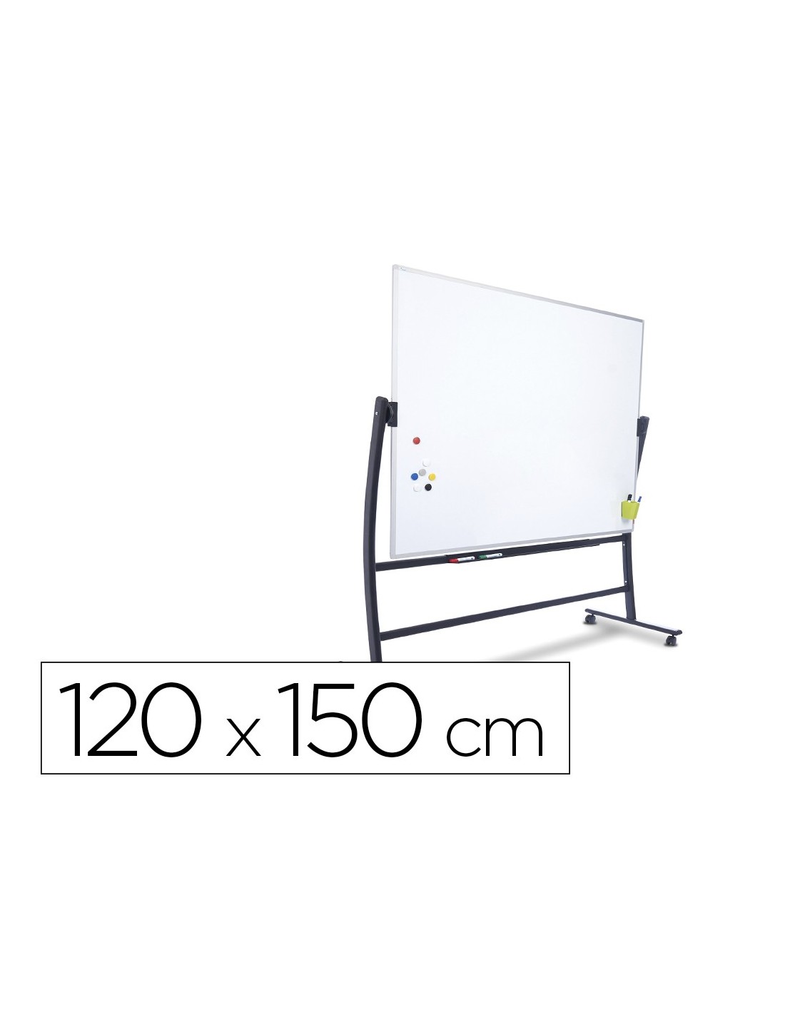 Pizarra móvil volteable de doble cara 120x150 cm. Superficie blanca de acero lacado magnético y marco de aluminio anodizado. Incluye bandeja para rotuladores. Estructura volteable con forma ergonómica curvada de gran diseño. Sistema patentado de rotación que permite el giro y bloqueo de la pizarra sin necesidad de accionar ninguna palanca o pomo, aportando mayor seguridad en el giro y evitando cualquier movimiento de oscilación o vibraciónal escribir. Estructura con ruedas para su desplazamiento. Incluye bandej a para rotuladores.