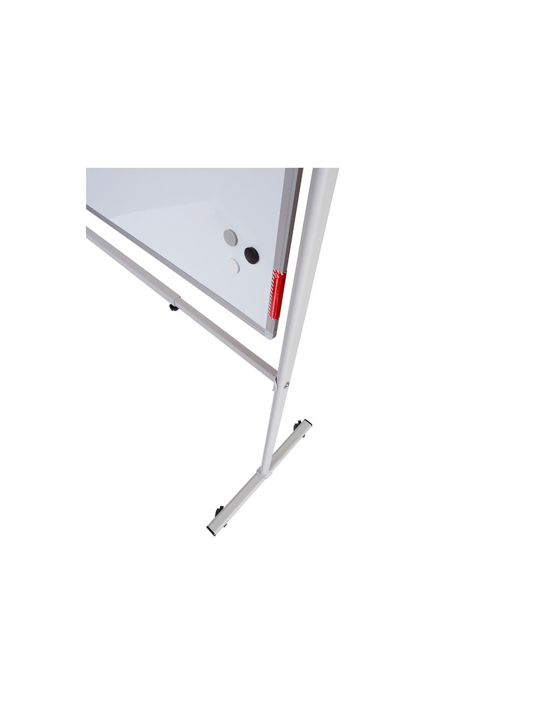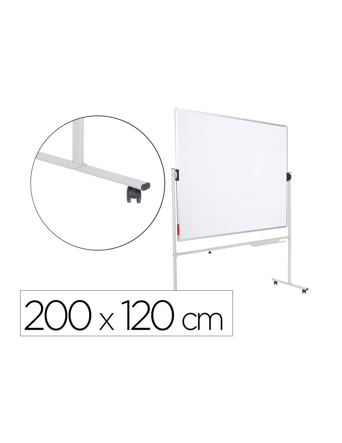 Pizarra móvil volteable de doble cara 120x200 cm. Superficie blanca de acero lacado magnético y marco de aluminio anodizado. Incluye bandeja para rotuladores. Estructura volteable. Sistema patentado de rotación que permiteel giro y bloqueo de la pizarra sin necesidad de accionar ninguna palanca o pomo, aportando mayor seguridad en el giro y evitando cualquier movimie nto de oscilación o vibración al escribir. Estructura con ruedas para su desplazamiento. Incluye bandeja para rotuladores.
