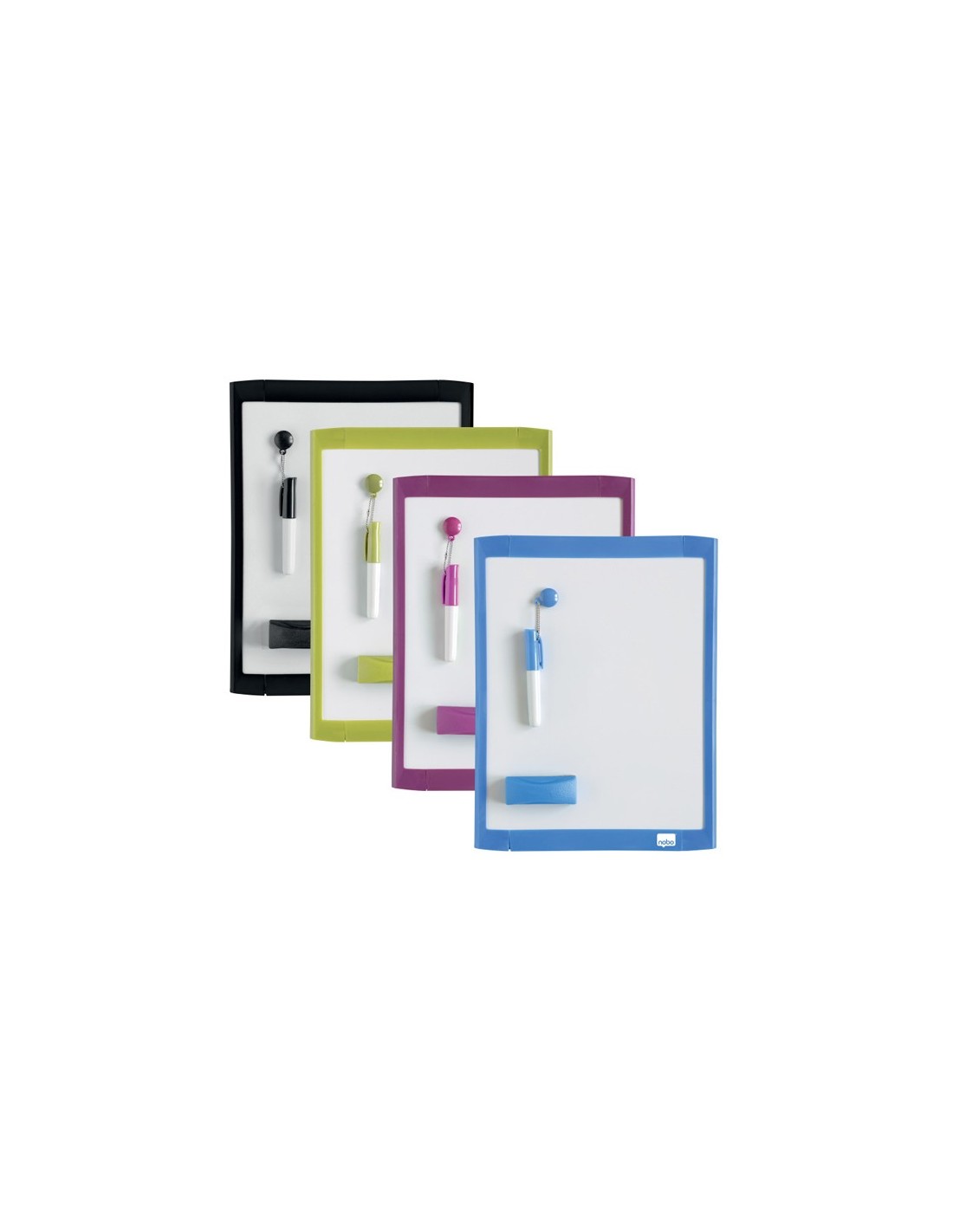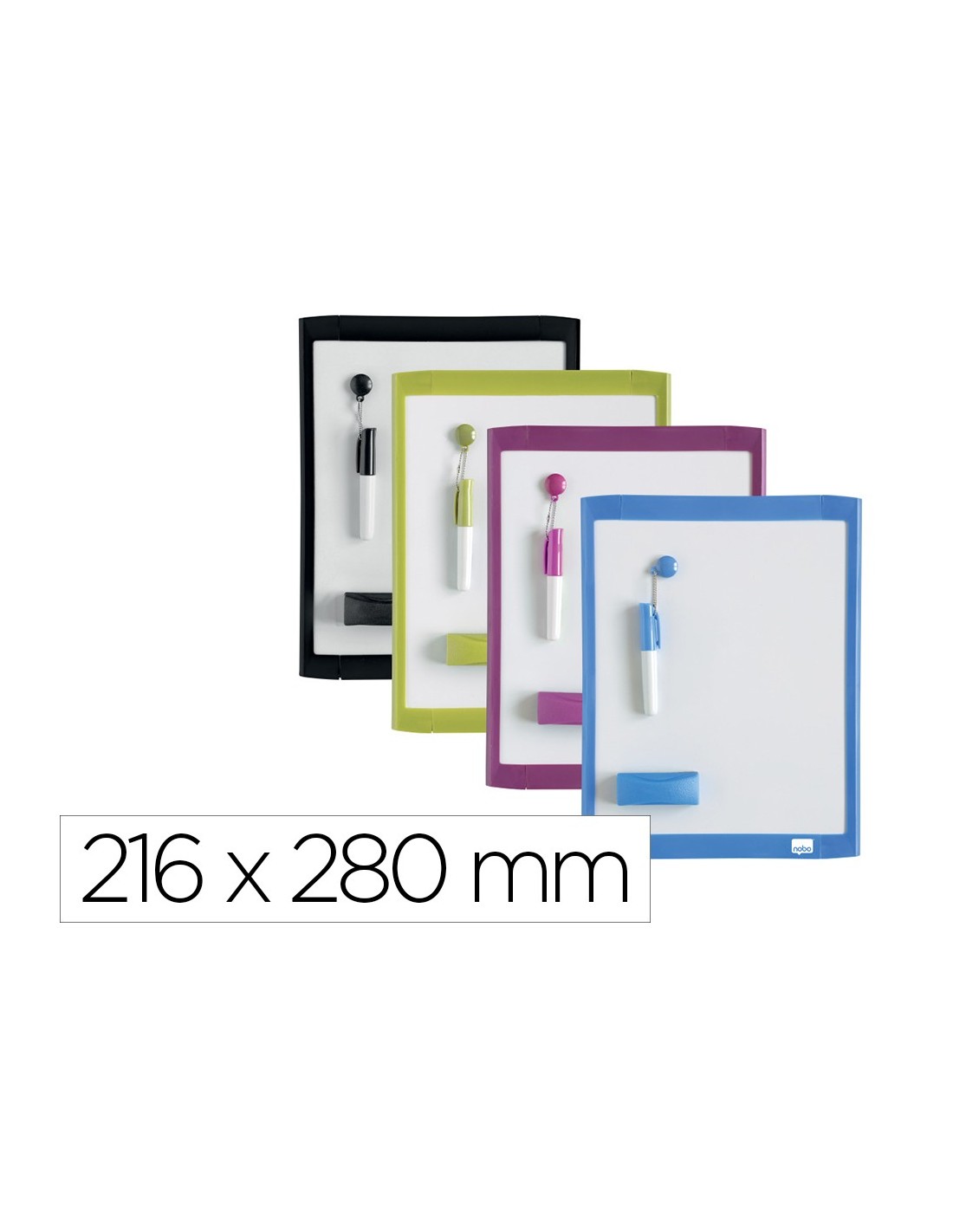 Esta mini pizarra magnética viene en una variedad de colores de marco, conun rotulador y un borrador de pizarra a juego. Con un elegante marco en u na variedad de colores, rosa, azul, negro o verde. Cualquiera que sea el color que recibas, puedes estar seguro de que se adaptará a cualquier entorno. Estas divertidas y coloridas pizarras son perfectas para el montaje enla pared o para usar como pizarra portátil, y se completan con almohadill as adhesivas de montaje en pared e imanes para usar en superficies magnéticas como la nevera. Móntalas en orientación vertical u horizontal. Tamaño: 216x280 mm.