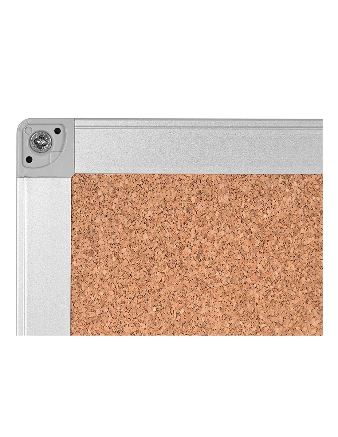 Con marco de aluminio plata mate y cantonera decorativa de plástico gris claro. Provisto de accesorios de fijación a la pared. 5 mm de grosor de corcho extra.