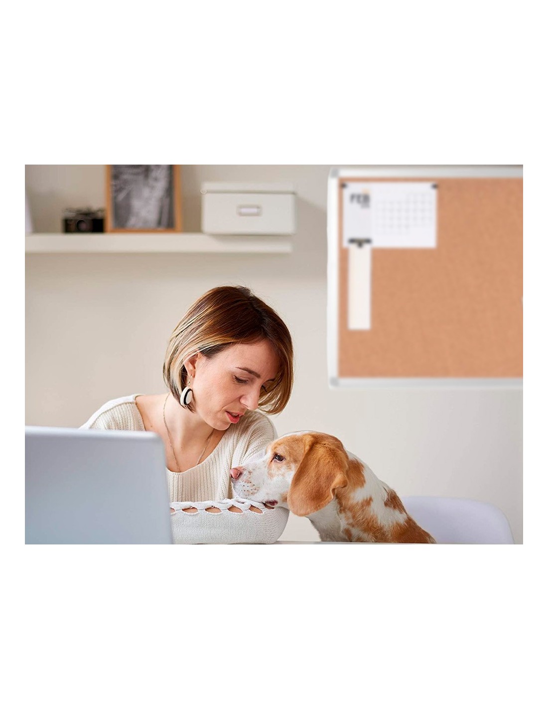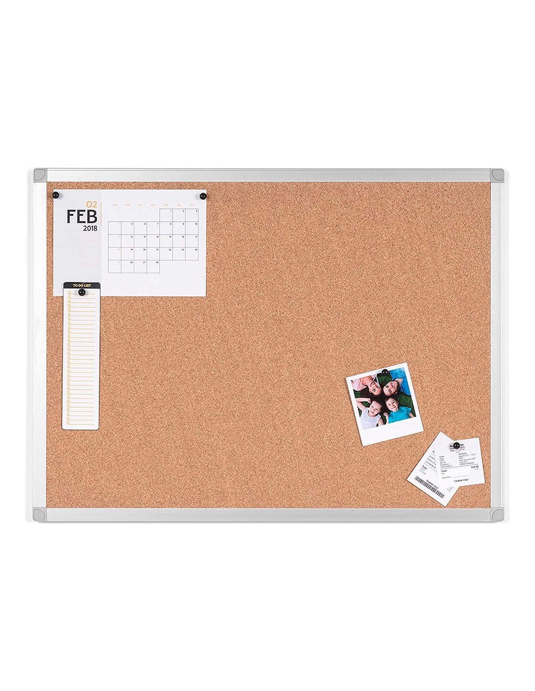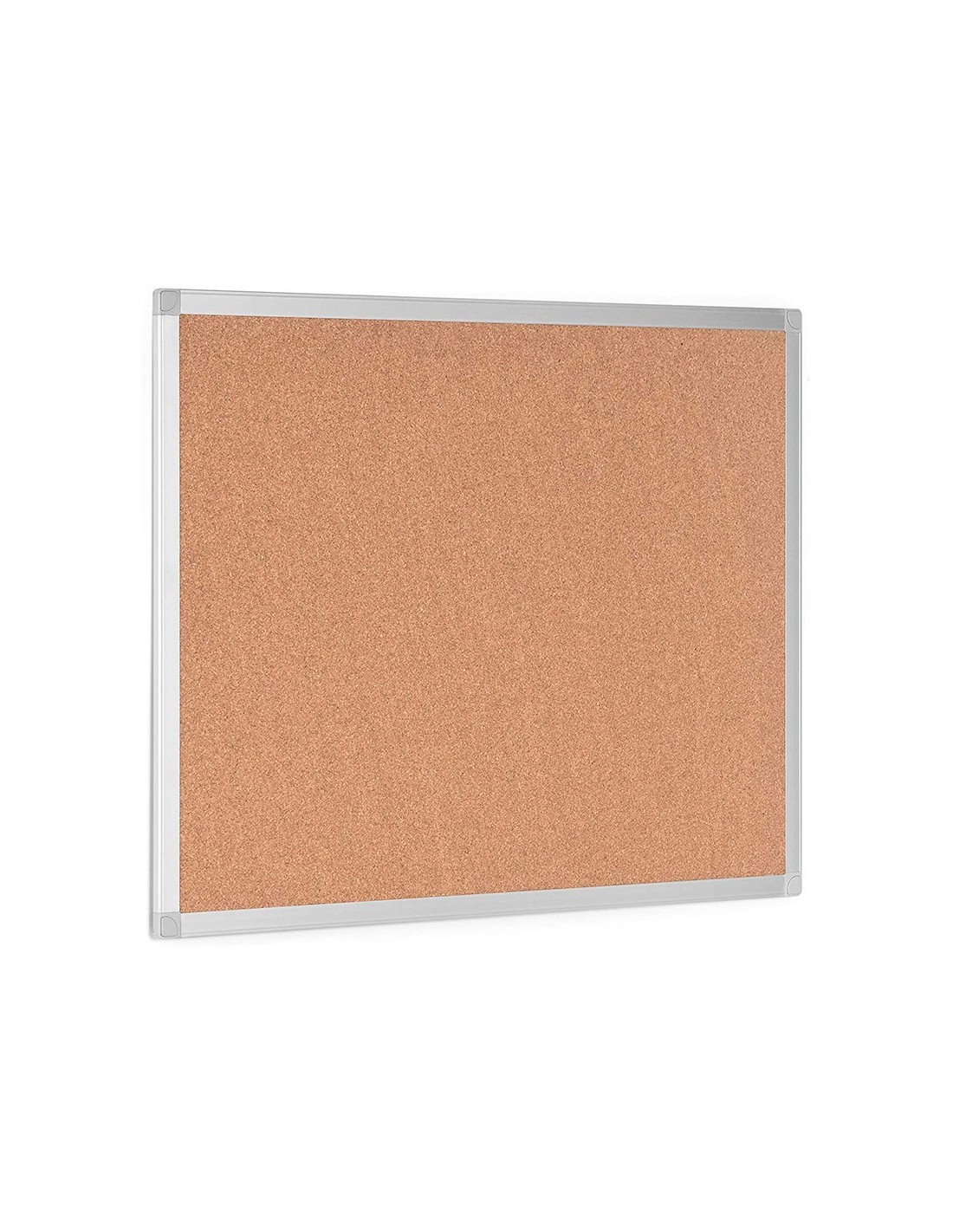 Con marco de aluminio plata mate y cantonera decorativa de plástico gris claro. Provisto de accesorios de fijación a la pared. 5 mm de grosor de corcho extra.