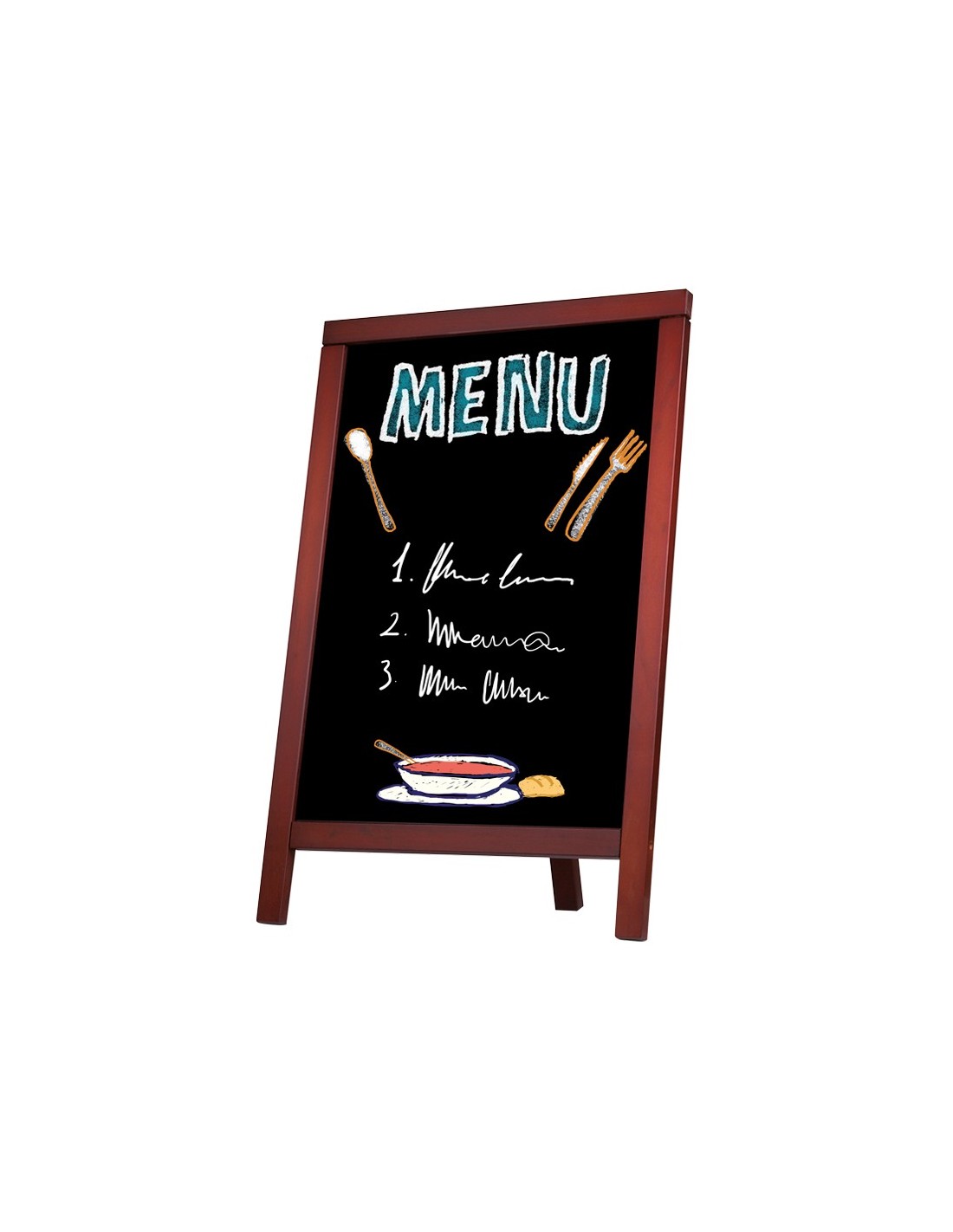 Pizarra negra de madera, con caballete, de suelo. Óptima para captar la atención de sus clientes sea cual sea su establecimiento, comunicando su horario, menús, precios, etc. Para rotulador tipo tiza.