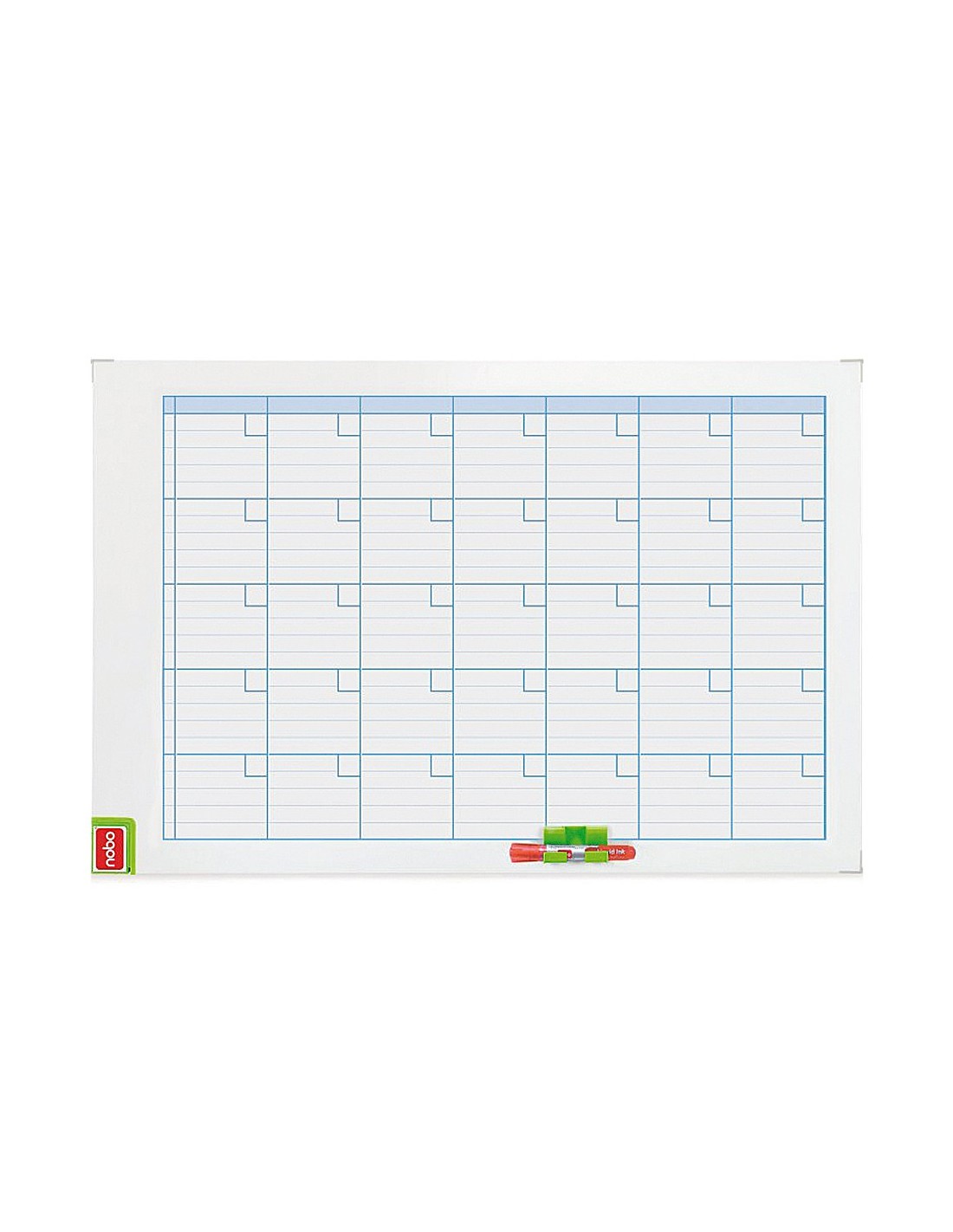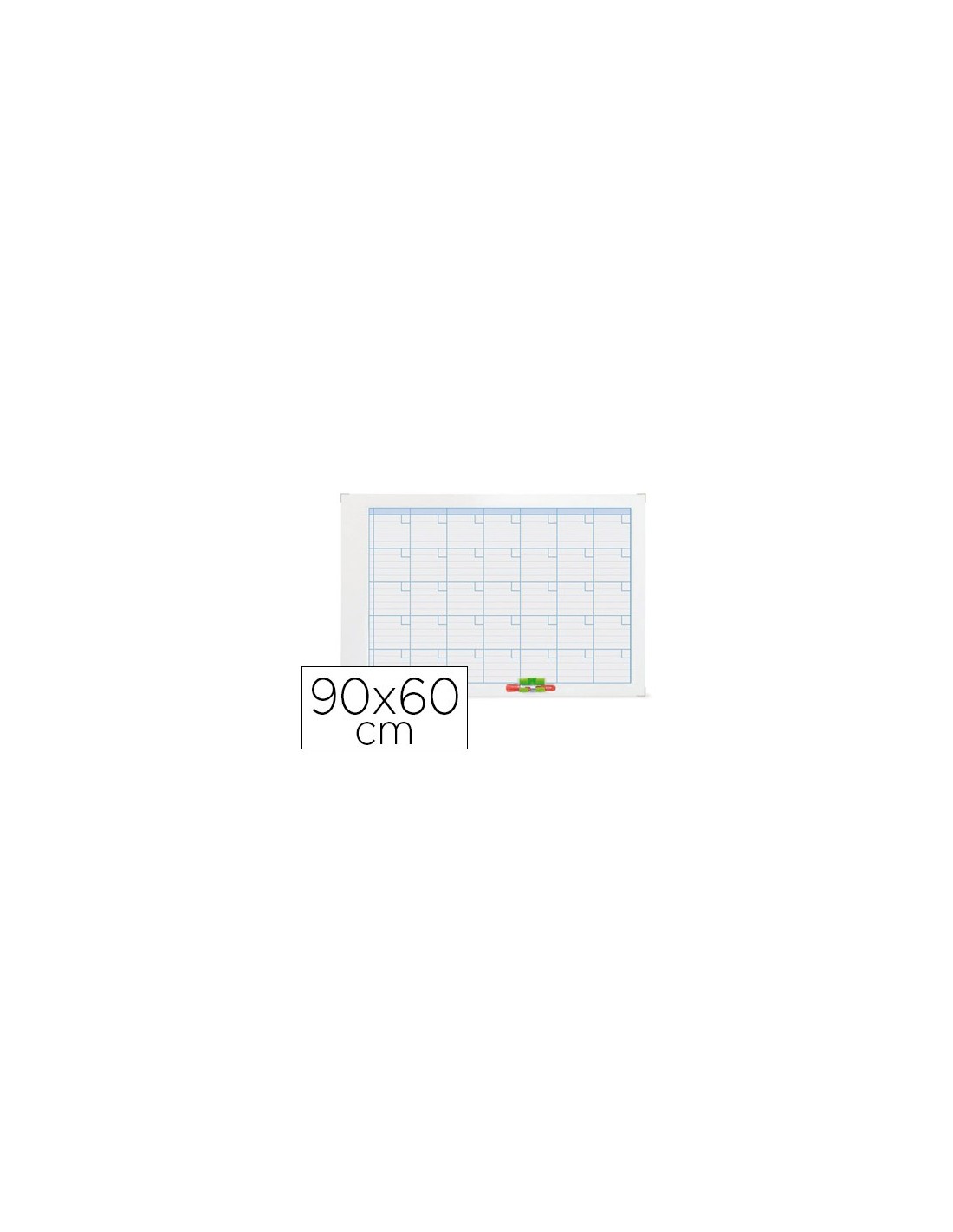 Planning mural rotulado con un mes y con días encuadrados en blanco con líneas para anotaciones. Superficie blanca magnética para la colocación de imanes y para escribir con rotuladores de borrado en seco. Marco metálico. Borrador magnético y clip para rotulador integrados. Incluye rotulador de pizarra blanca y un kit magnético de planificación. Medidas: 90 x 60 cm.