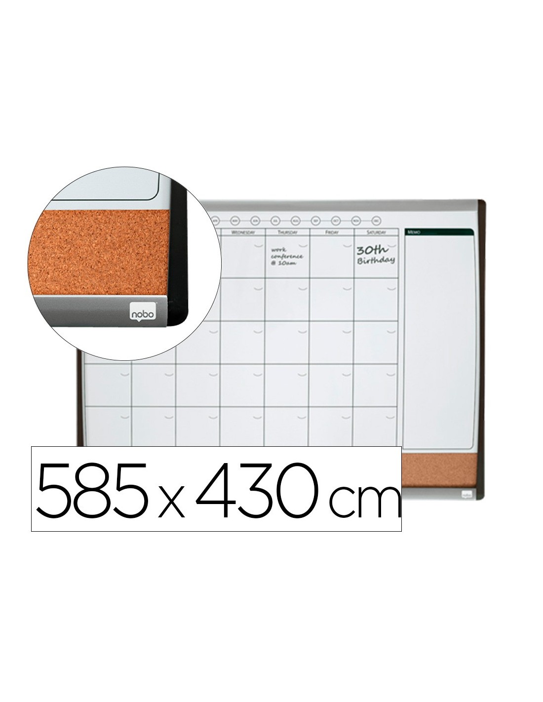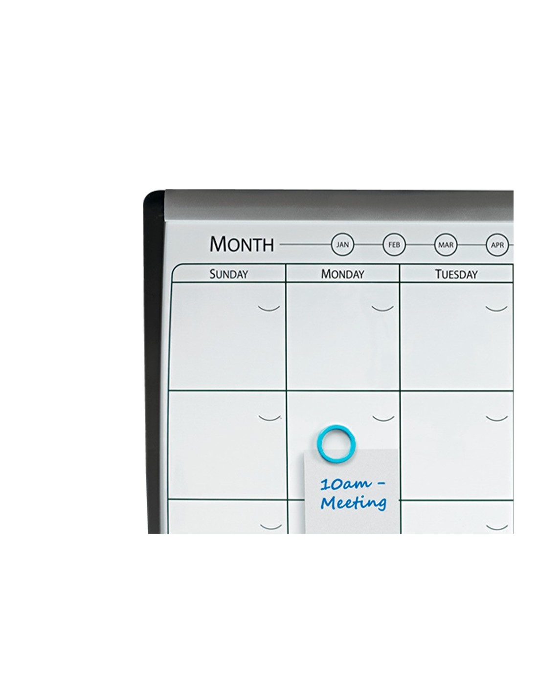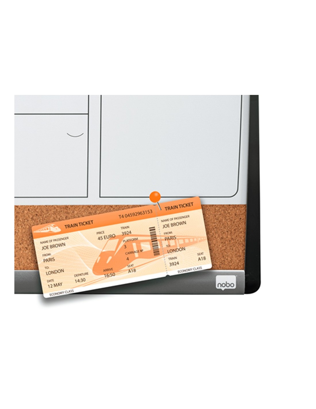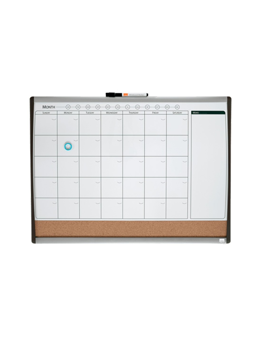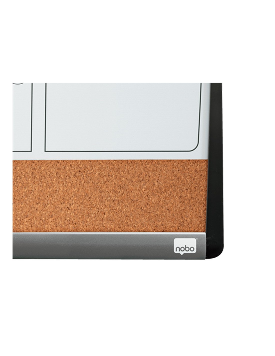 Pequeño planificador de pizarra magnética de borrado en seco y una parte de corcho como tablero de anuncios para fijar notas. Se puede montar en la pared con almohadillas adhesivas o en superficies metálicas con imanes. Incluye un clip portarrotulador integrado, un rotulador para pizarra con un borrador en la tapa, almohadillas adhesivas e imanes de montaje.