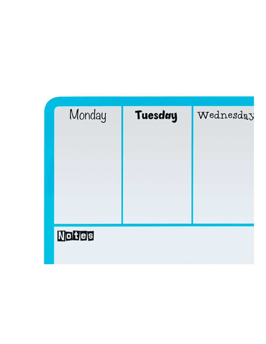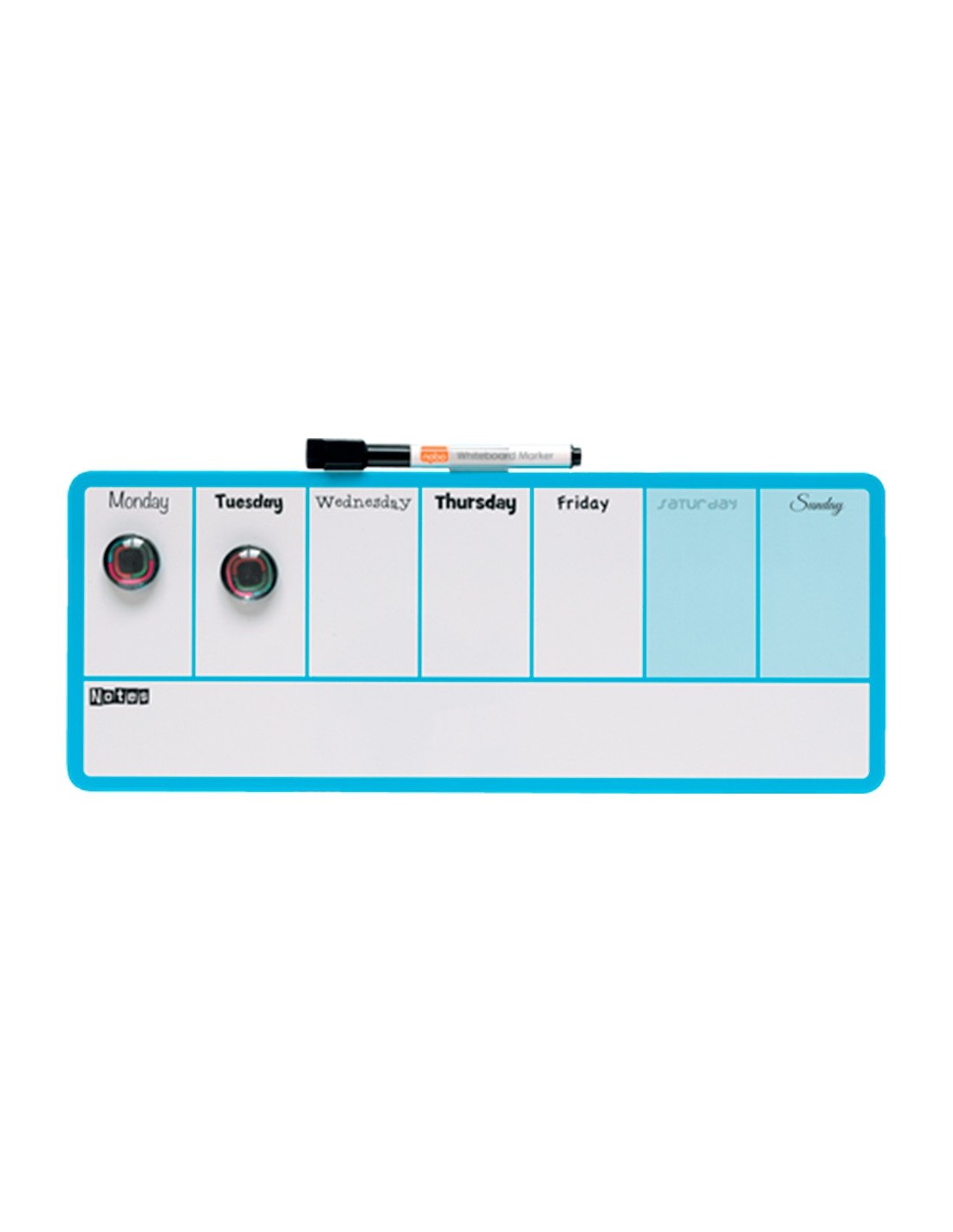 Miniplanificador semanal de pizarra magnética. Con una parte de pizarra de borrado en seco para tomar notas para cada día de la semana más una sección de notas adicionales. Incluye clip portarrotulador integrado, 2 almohadillas de montaje adhesivas para pizarra blanca y 2 imanes. Medidas: 36 x 14 cm.