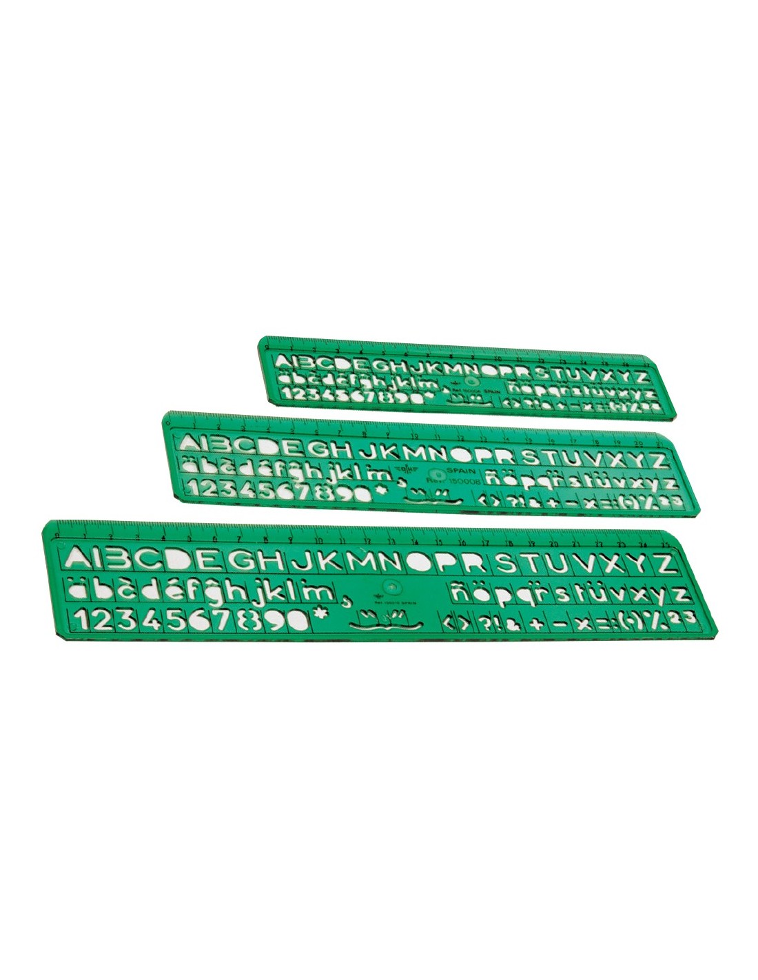 Rotulación gruesa recta. Medidas de la letra: 6, 8 y 10 mm. El juego de 3 plantillas.