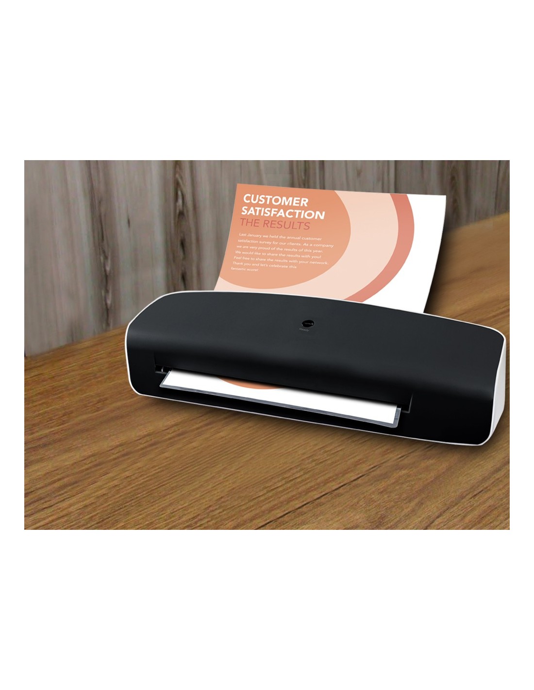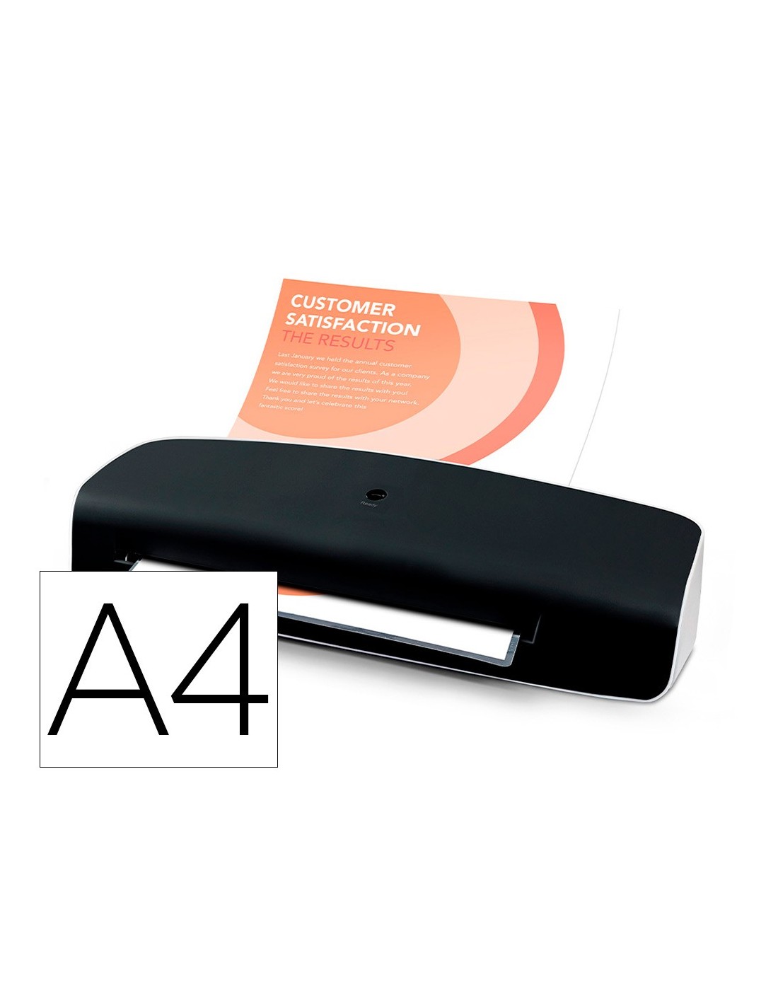 Tecnología de 2 rodillos calientes. Tiempo de calentamiento de 2 minutos y alcanza temperaturas entre 135 C. Utiliza fundas de hasta 125 micras. Velocidad de plastificación 400 mm/min. Incluye sistema liberador de rodillos antiatasco. Cuerpo de ABS. Adecuado para plastificación de papel formato DIN A4 de hasta 160 g/m². Medidas: 352 x 117 x 76 mm. Peso: 1,1 kg.