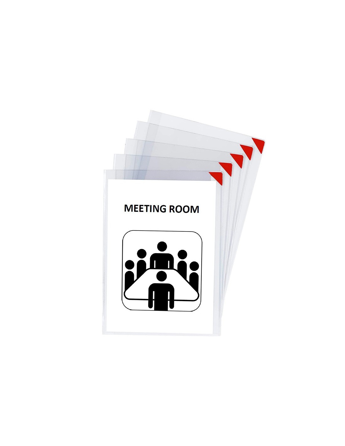 Funda en PVC con adhesivo reposicionable en el dorso y cierre por esquina imantada roja. Capacidad: hasta 10 hojas de 80 g/m². Se lee por ambas caras. Ideal para superficies lisas: escaparates, puertas, pared, metal, etc. No deja residuos. Vertical / horizontal.