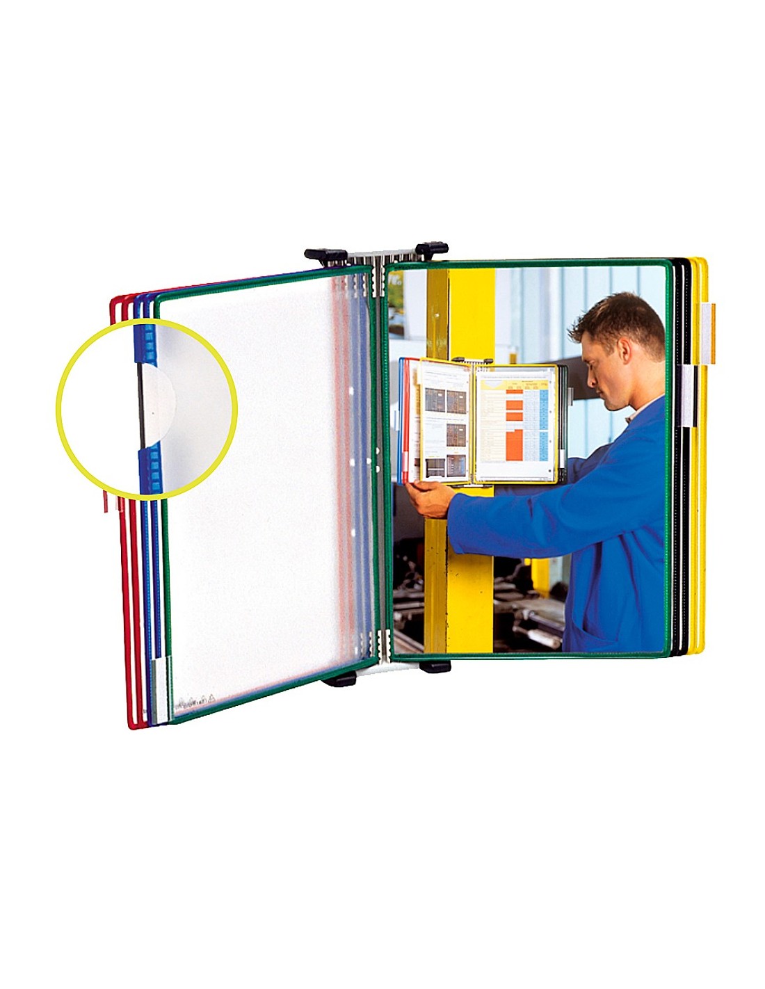 Soporte en metal de alta resistencia con 10 fundas fabricadas en PVC en colores surtidos. Incluye 5 índices neutro / color. Extensión al infinito. Material de fijación proporcionado: tacos y tornillos.