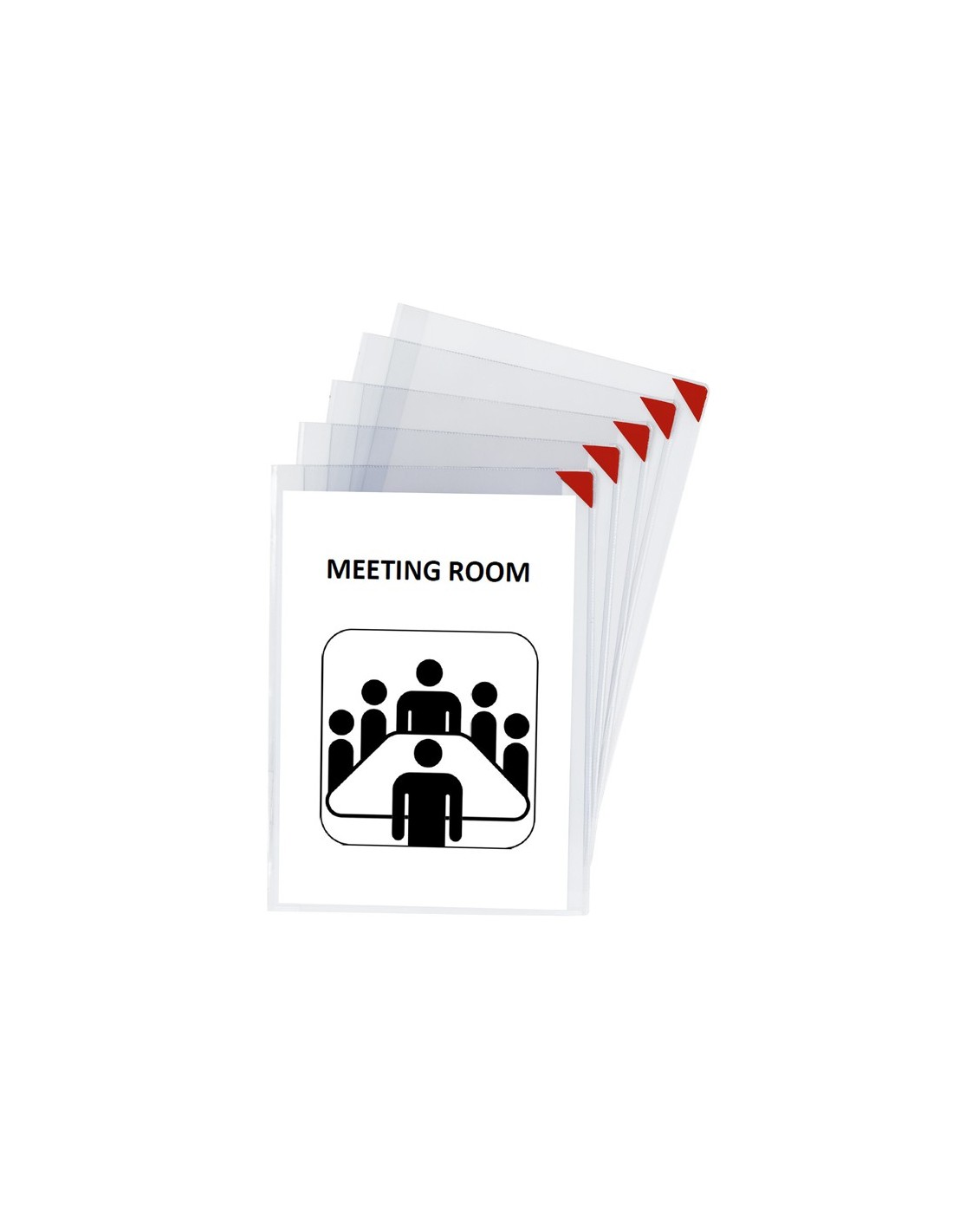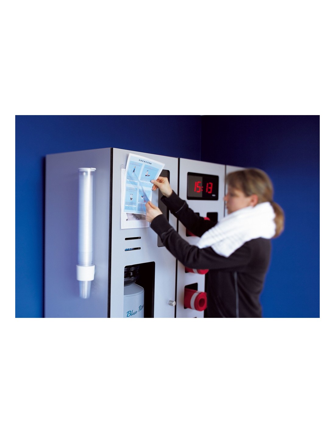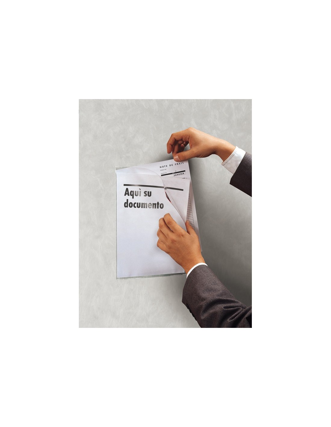 Funda en PVC con adhesivo reposicionable en el dorso y cierre por esquina imantada roja. Capacidad: hasta 10 hojas de 80 g/m². Se lee por ambas caras. Ideal para superficies lisas: escaparates, puertas, pared, metal, etc. No deja residuos. Vertical / horizontal.