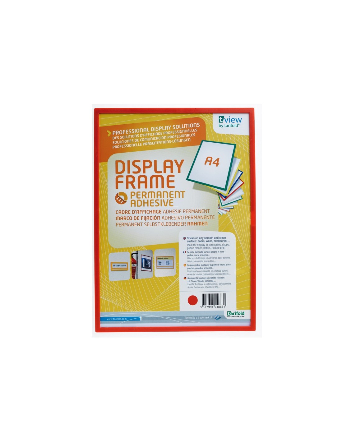 Marco de identificación ligero y robusto. Para colocar fácilmente sobre cualquier superficie lisa. Fijación adhesiva sin herramientas. Fabricado en plástico ABS irrompible. Formato DIN A4.