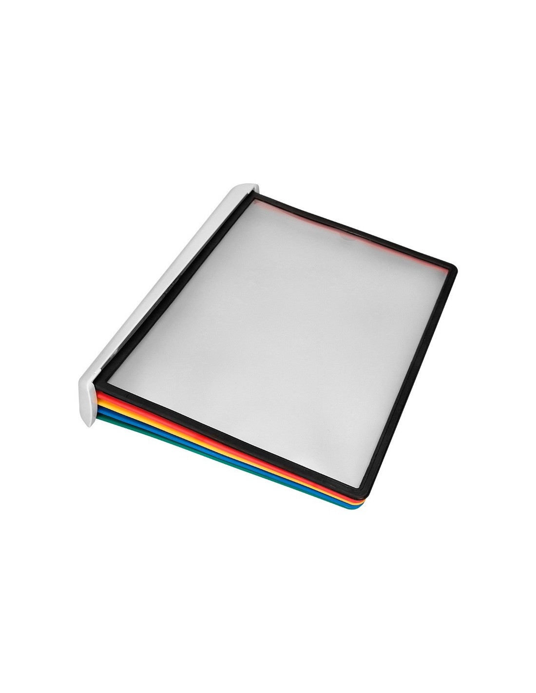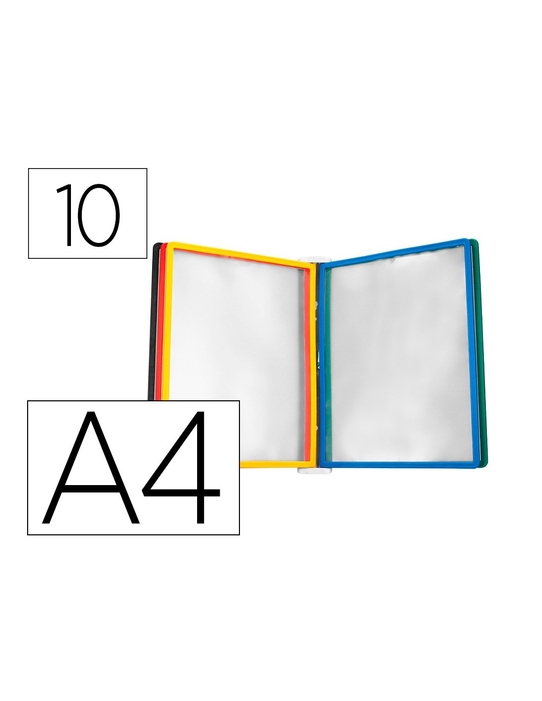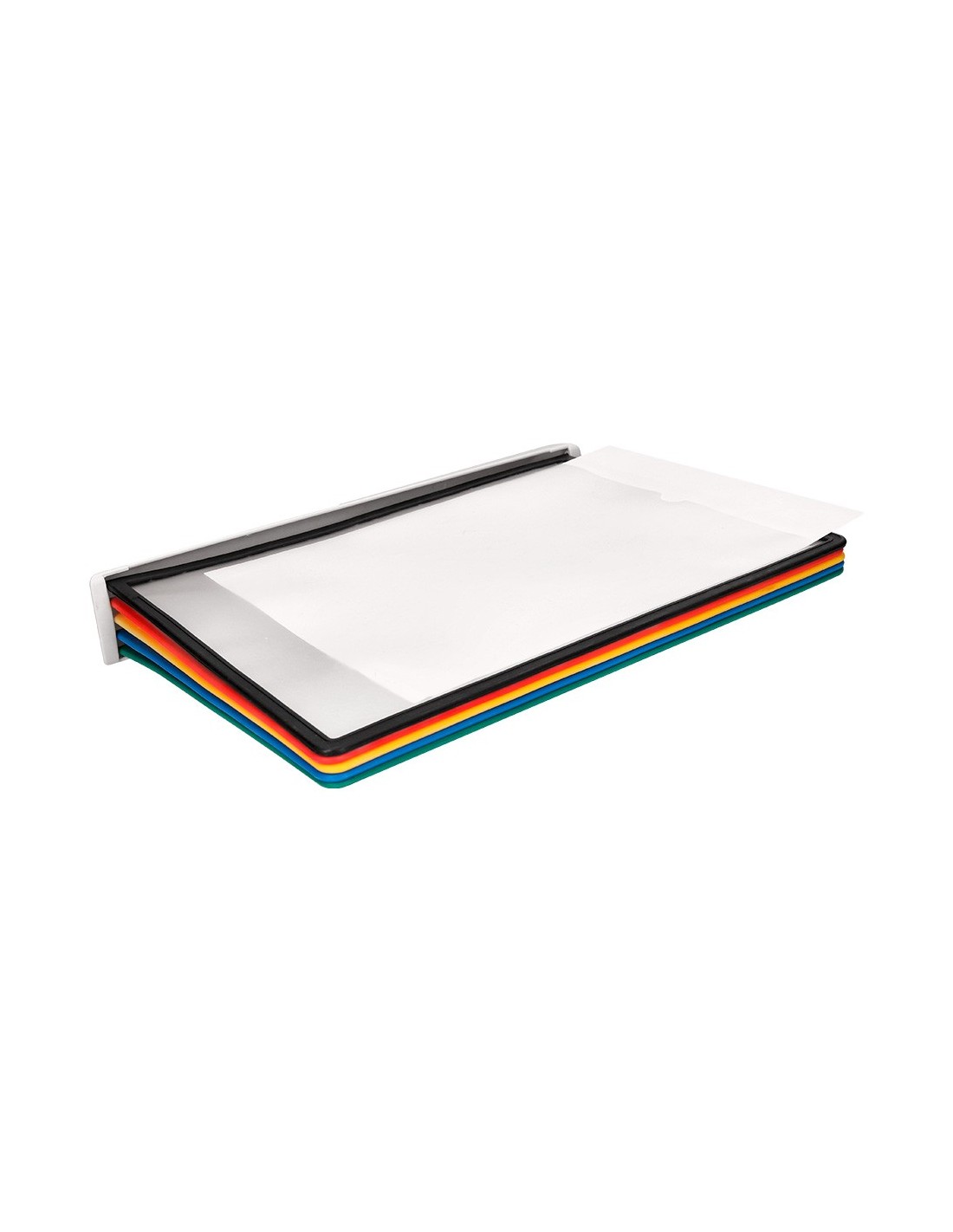 Soporte para pared en plástico de alta resistencia con 10 fundas de colores surtidos DIN A4, fabricadas en PVC en colores surtidos. Se adapta al volumen de la documentación, gran visibilidad y versatilidad. Fácil instalación. Material de fijación: tornillos y tacos.