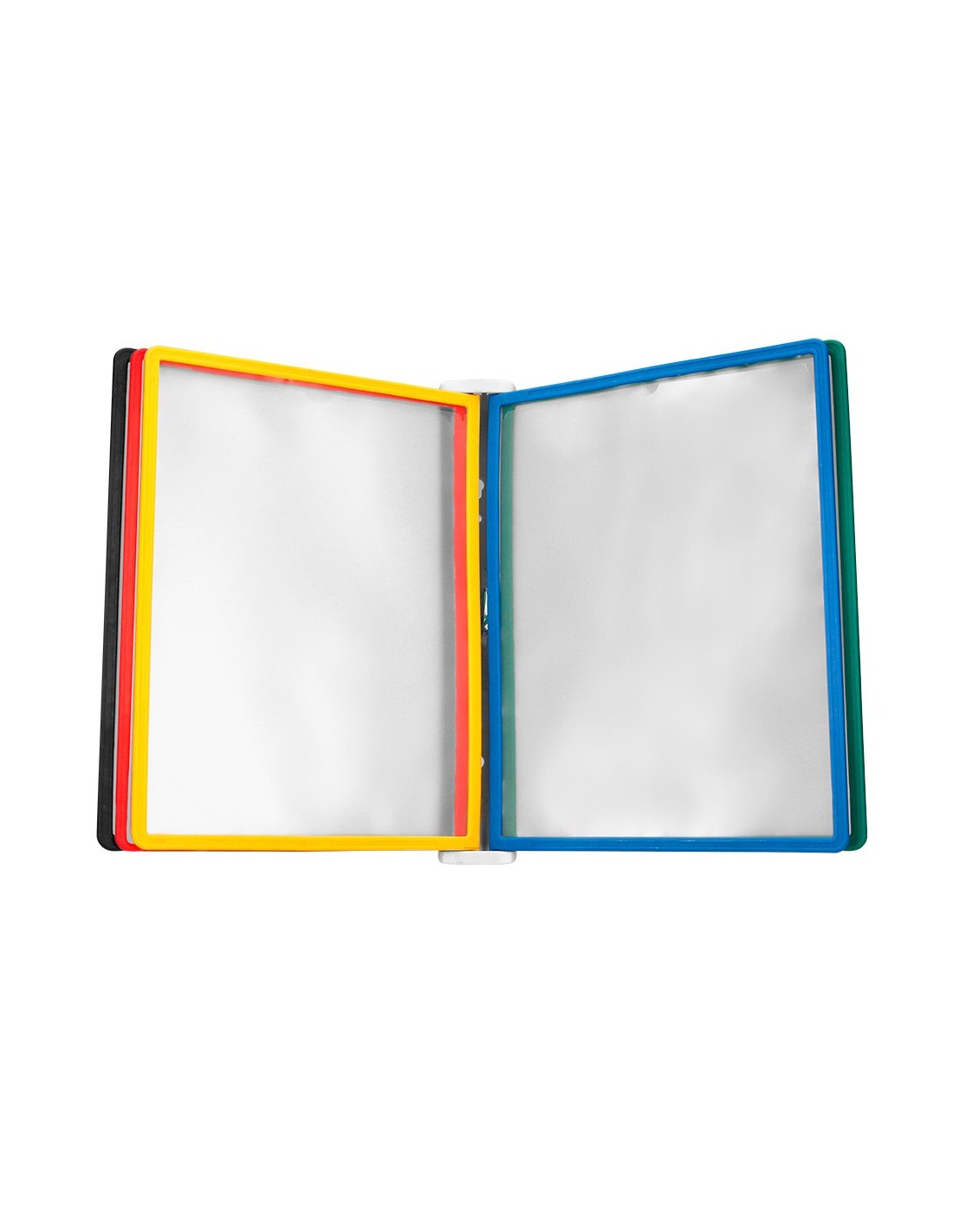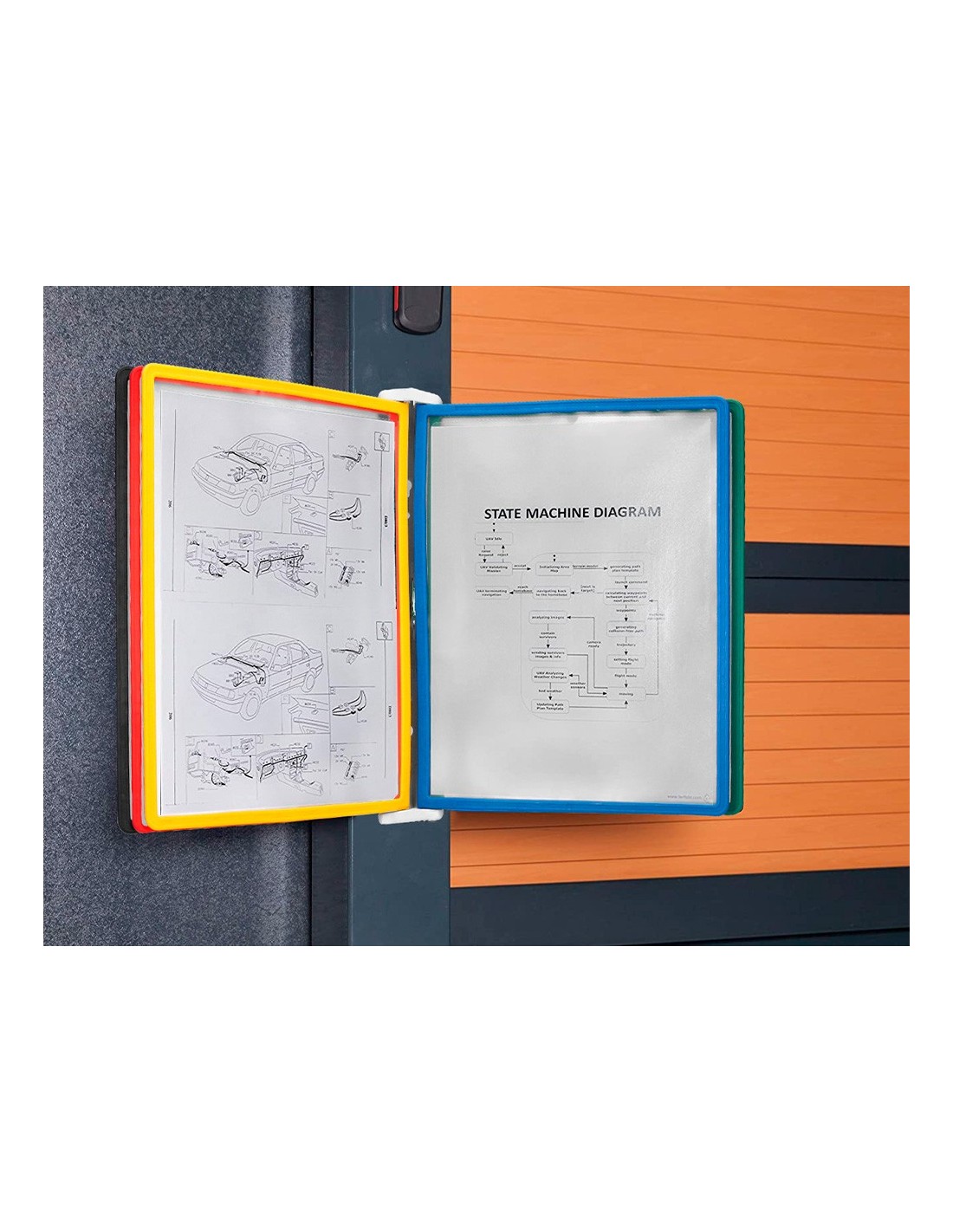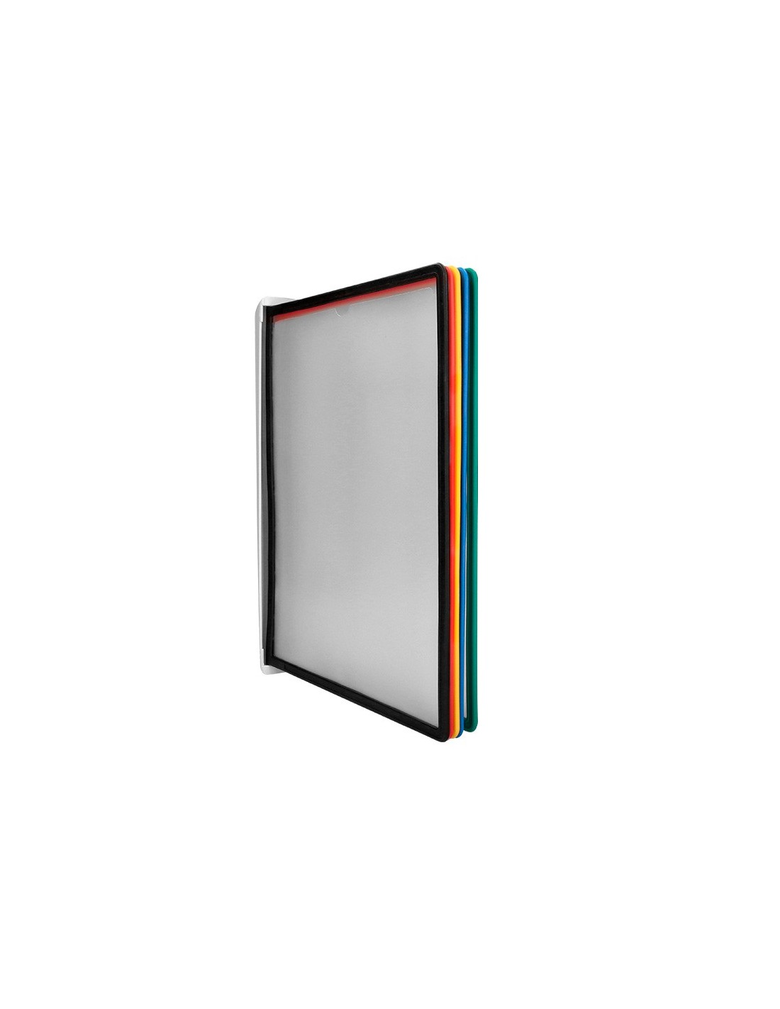Soporte para pared en plástico de alta resistencia con 10 fundas de colores surtidos DIN A4, fabricadas en PVC en colores surtidos. Se adapta al volumen de la documentación, gran visibilidad y versatilidad. Fácil instalación. Material de fijación: tornillos y tacos.