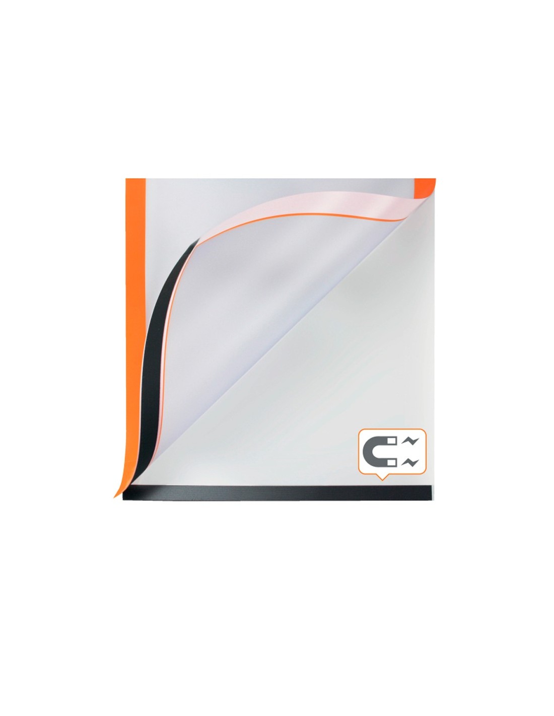Marco magnético autoadhesivo para la exposición segura de carteles, señales e información. El marco cuenta con una banda magnética en la parte inferior del marco que permite cambiar el contenido de forma rápida y sencilla y mantener las páginas seguras. Este marco magnético se fija firmemente a superficies planas en formato vertical u horizontal gracias a su base autoadhesiva, y la tapa mate transparente ayuda a proteger el contenido que hay debajo y se puede limpiar con un paño. Área de exposición A4. Pack de 2 marcos informativos de color naranja.