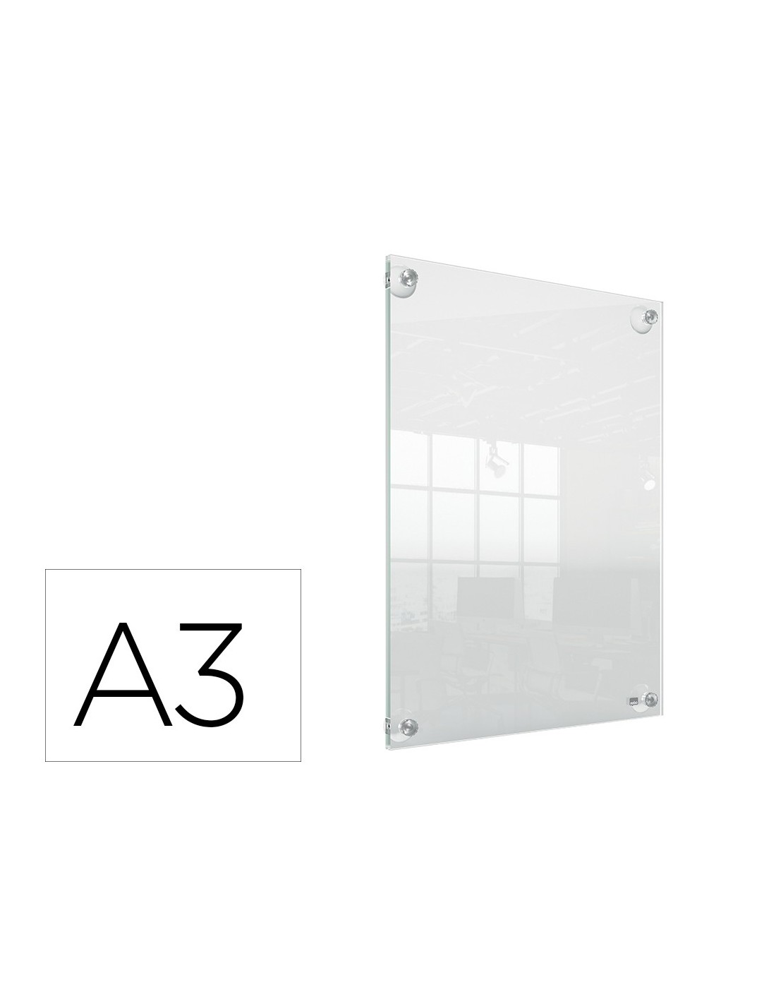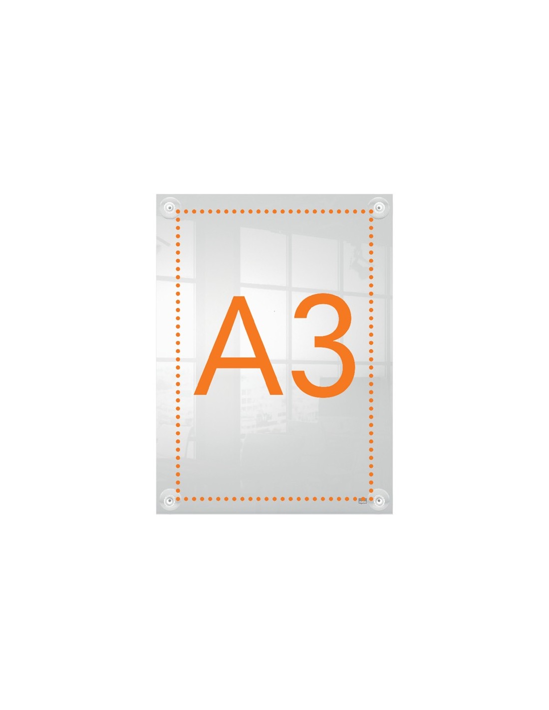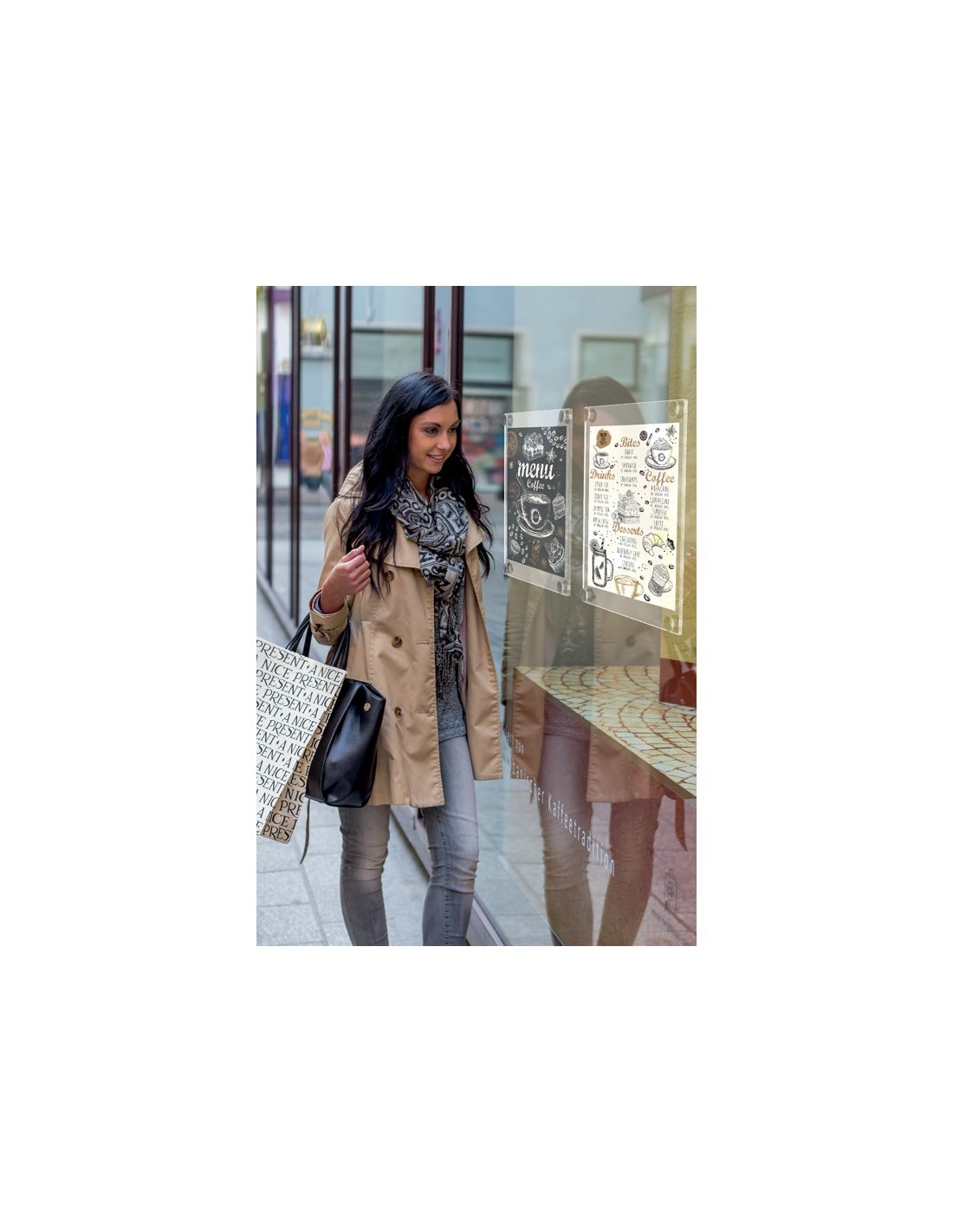 Este porta póster acrílico montable y fácil de mover, con un moderno diseño sin marco, proporciona una sensación elegante y contemporánea. Gracias asu montaje con ventosas, el porta póster se adhiere a cualquier superfici e no porosa en formato vertical u horizontal y ofrece un cambio de contenido rápido y sencillo. La superficie transparente se puede limpiar fácilmente, lo que convierte a este soporte en la solución ideal para la exposición de carteles, documentos o información temporal y permanente. Tamaño de la superficie de exposición A3.