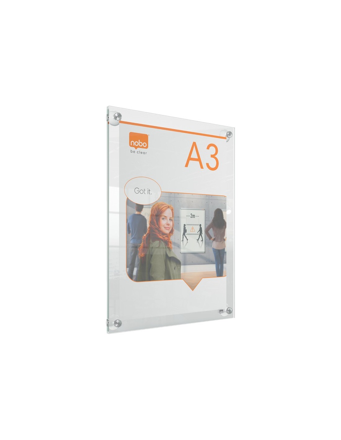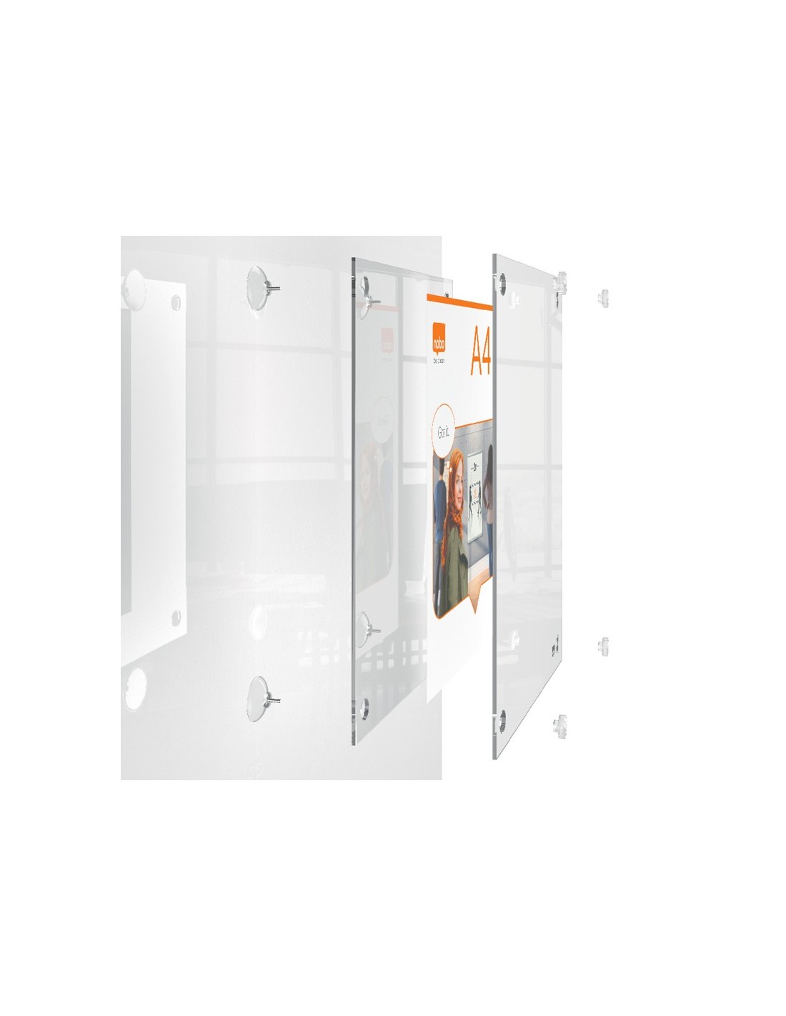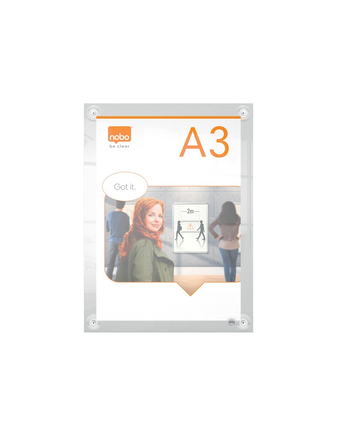Este porta póster acrílico montable y fácil de mover, con un moderno diseño sin marco, proporciona una sensación elegante y contemporánea. Gracias asu montaje con ventosas, el porta póster se adhiere a cualquier superfici e no porosa en formato vertical u horizontal y ofrece un cambio de contenido rápido y sencillo. La superficie transparente se puede limpiar fácilmente, lo que convierte a este soporte en la solución ideal para la exposición de carteles, documentos o información temporal y permanente. Tamaño de la superficie de exposición A3.