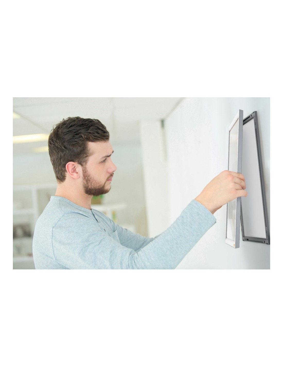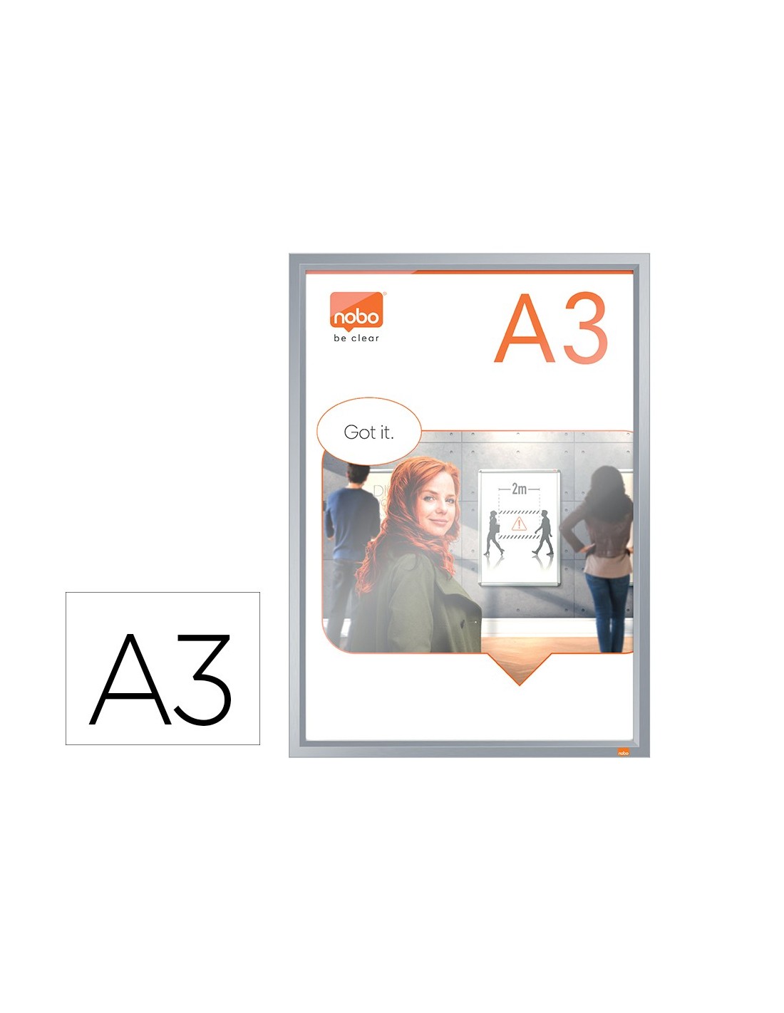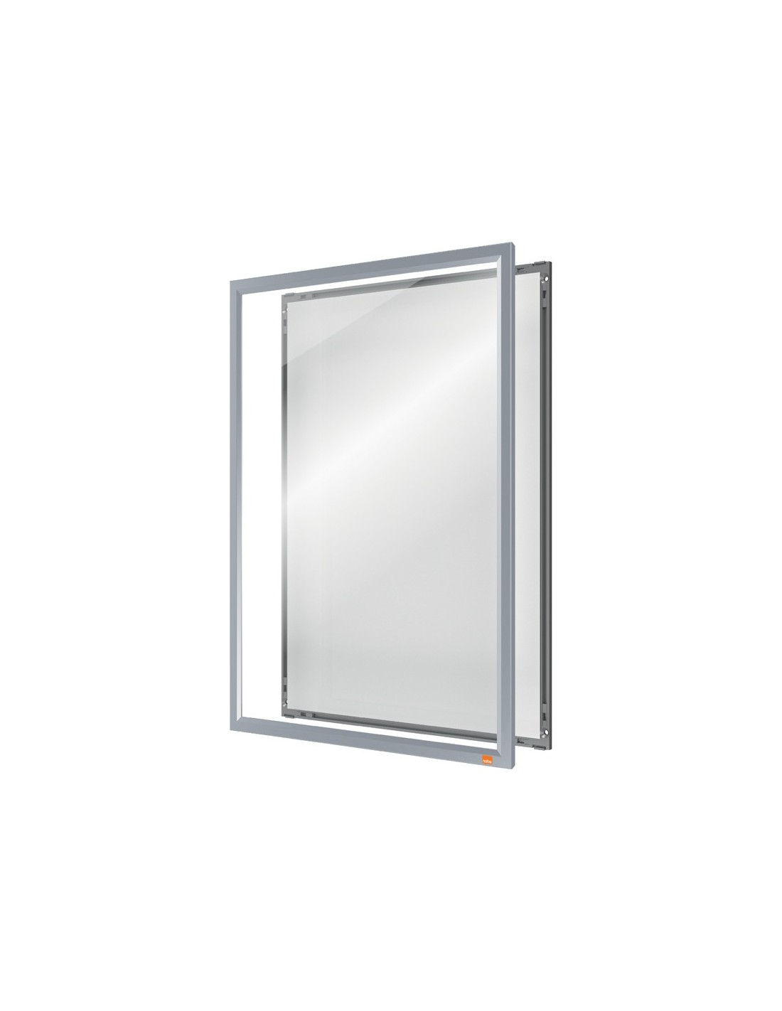 Este porta pósters montado en la pared tiene un elegante marco de clip de perfil bajo, esquinas biseladas sin fisuras y un mecanismo de cambio de contenido realmente innovador. Sólo tienes que retirar el marco de la pantalla frontal, cambiar el contenido detrás de la cubierta transparente y volver a colocar el marco de la pantalla con una simple conexión \"push click fit\". Esta solución de señalización estable y segura cuenta con un panel trasero que se fija firmemente a la pared mediante un montaje en esquina, loque permite sustituir el contenido sin necesidad de retirar el marco de l a pared. El innovador diseño mejora una solución de producto tradicional haciendo que la sustitución de los documentos sea un proceso rápido y sencincillo. Tamaño de la superficie de exposición A3.