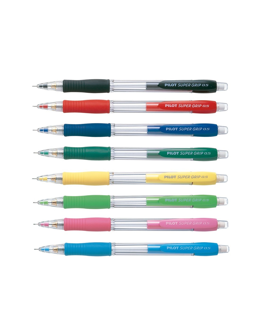 Portaminas de plástico con cuerpo transparente de diferentes colores. Sujeción de caucho. Con goma en el pulsador. Clip de plástico. Minas de 0,5 mm incluidas.