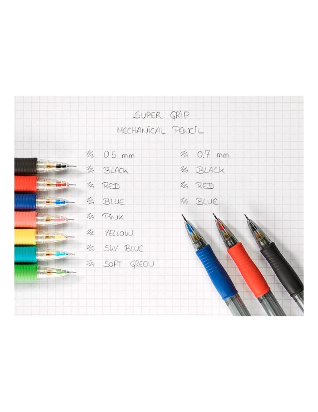 Portaminas de plástico con cuerpo transparente de diferentes colores. Sujeción de caucho. Con goma en el pulsador. Clip de plástico. Minas de 0,5 mm incluidas.