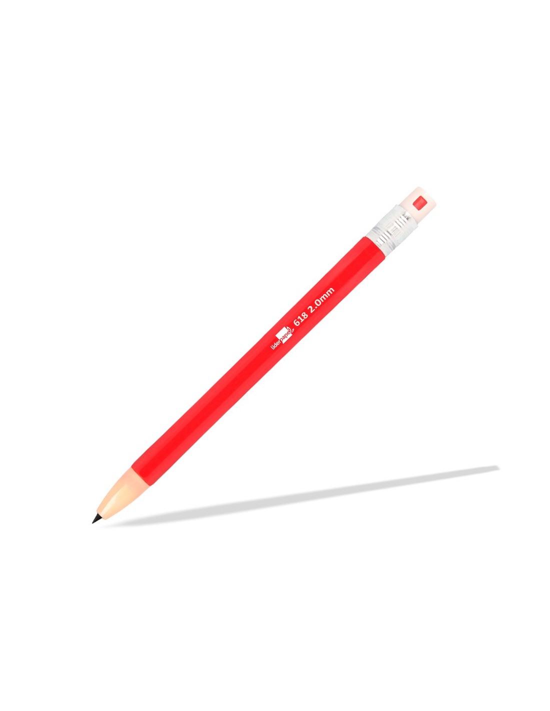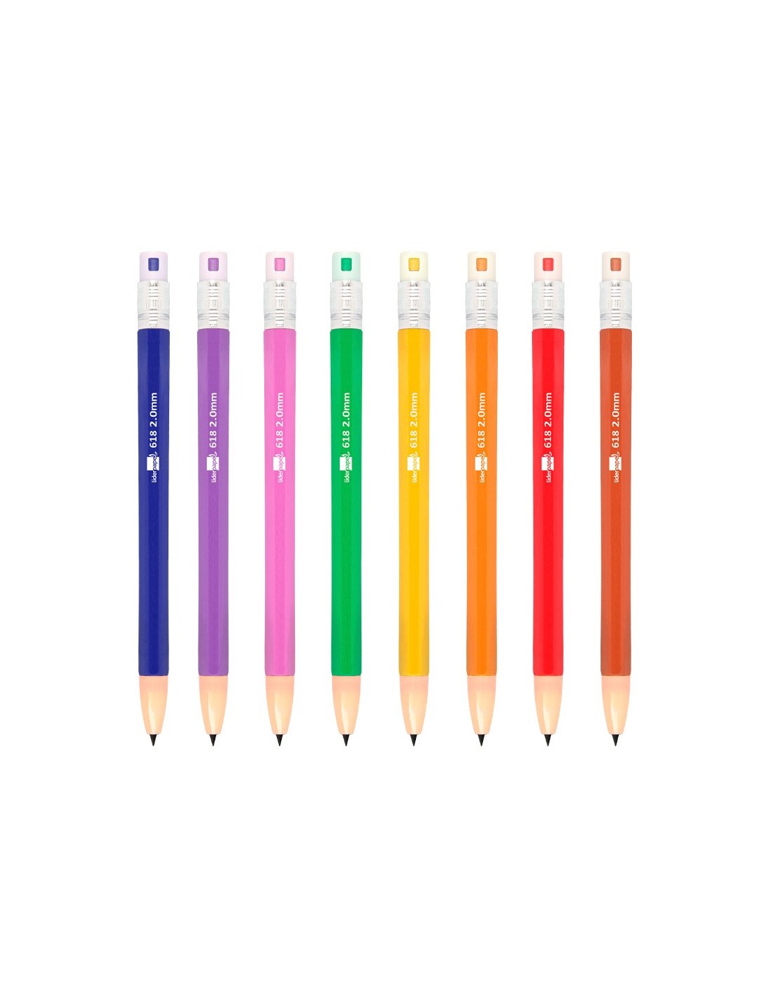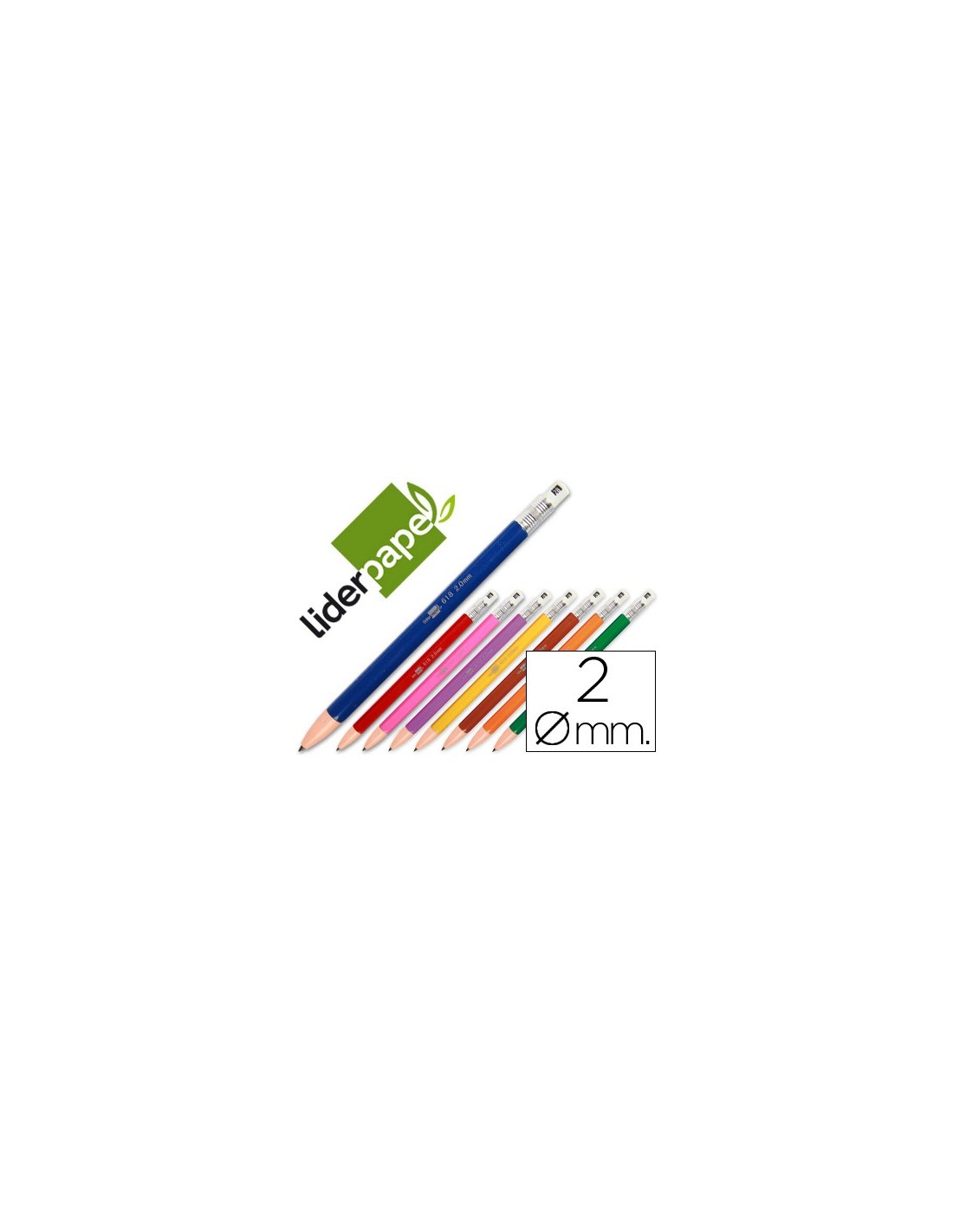 Fabricado en plástico. Con goma de borrar. Colores surtidos. Minas de grafito de 2 mm incluidas.