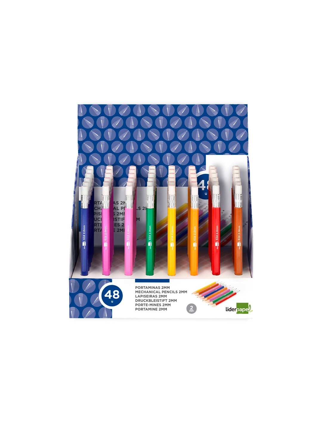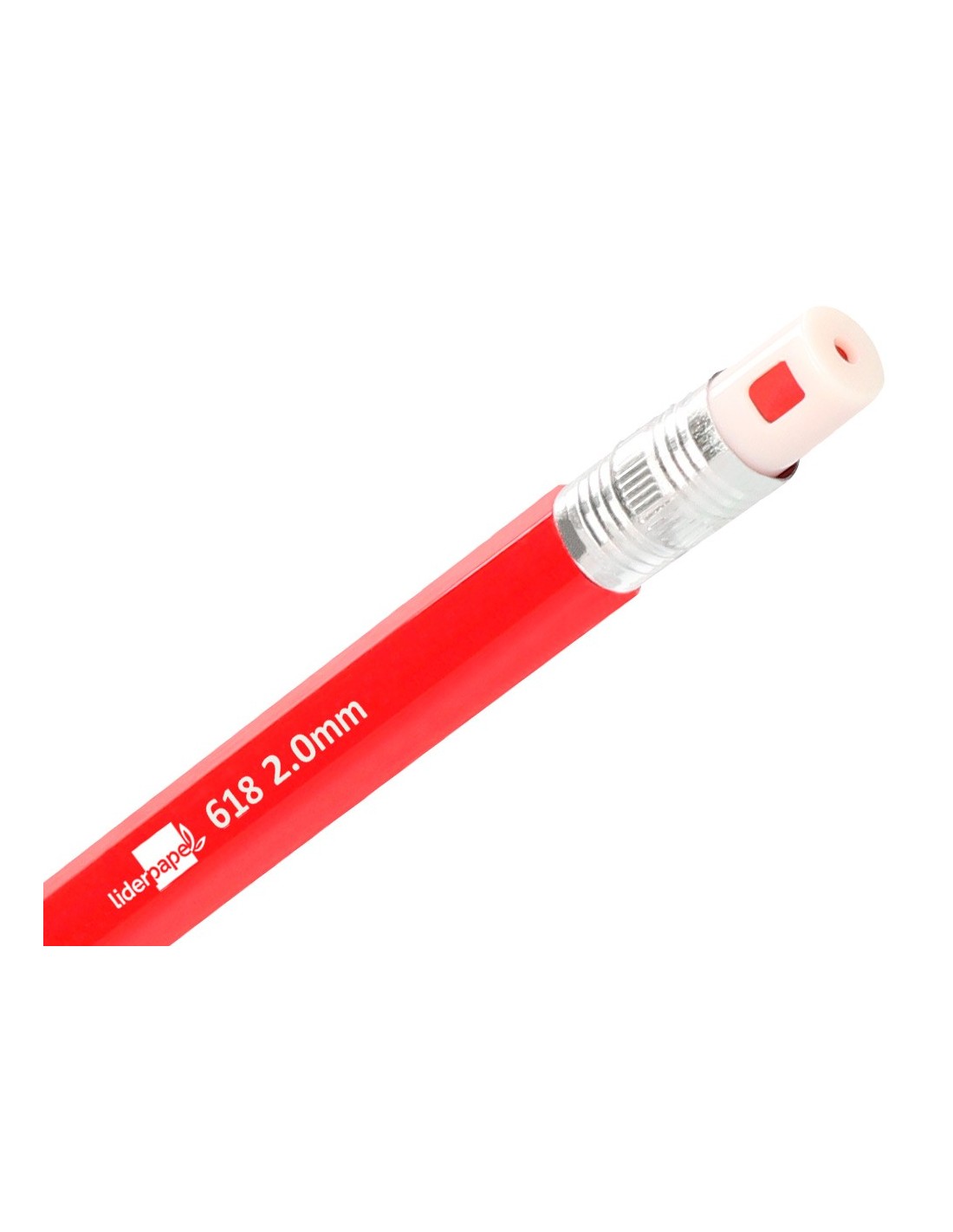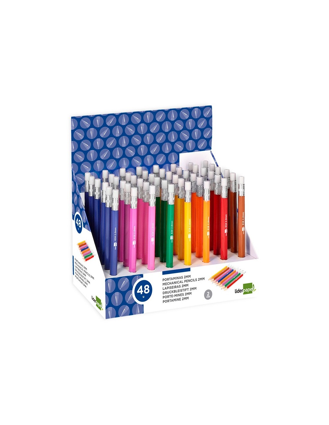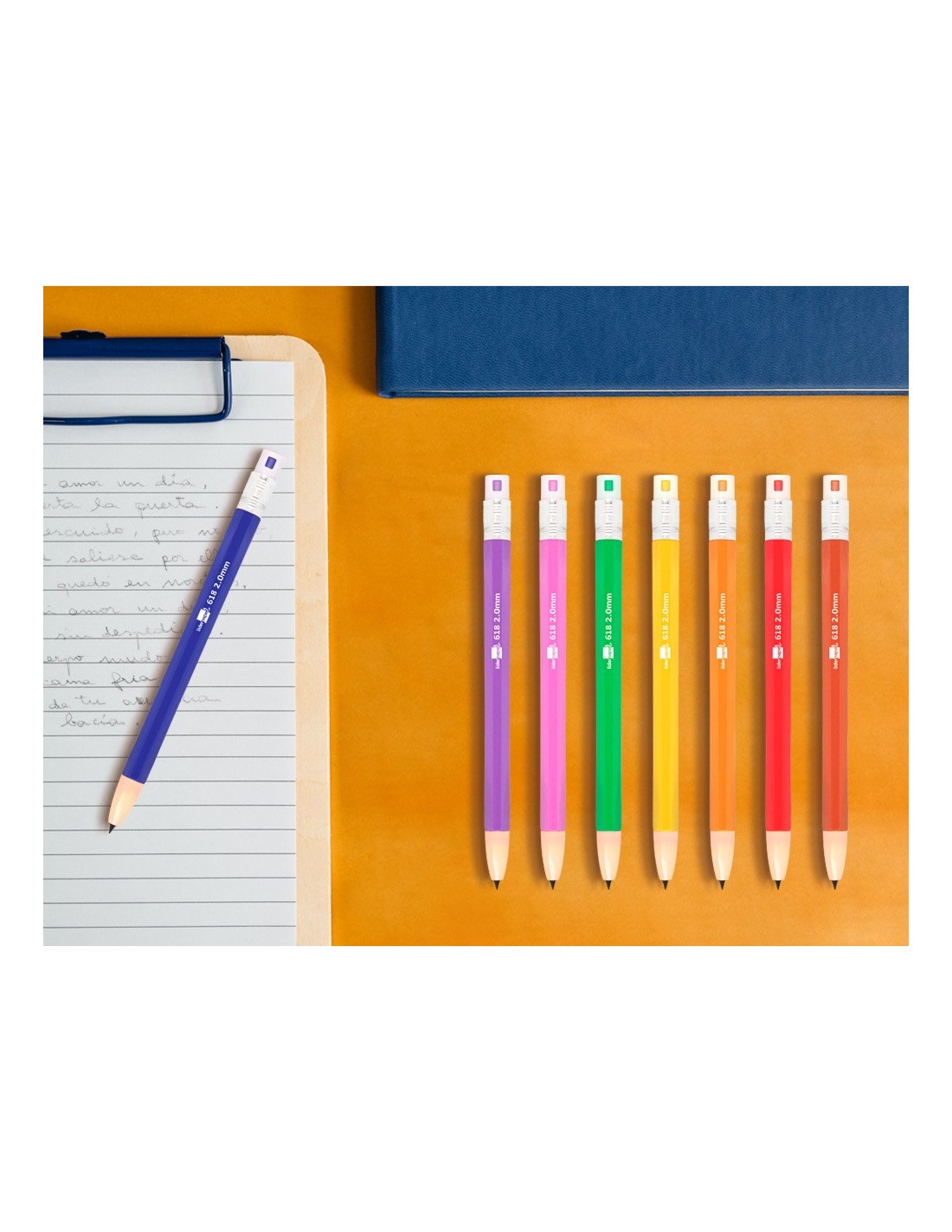 Fabricado en plástico. Con goma de borrar. Colores surtidos. Minas de grafito de 2 mm incluidas.