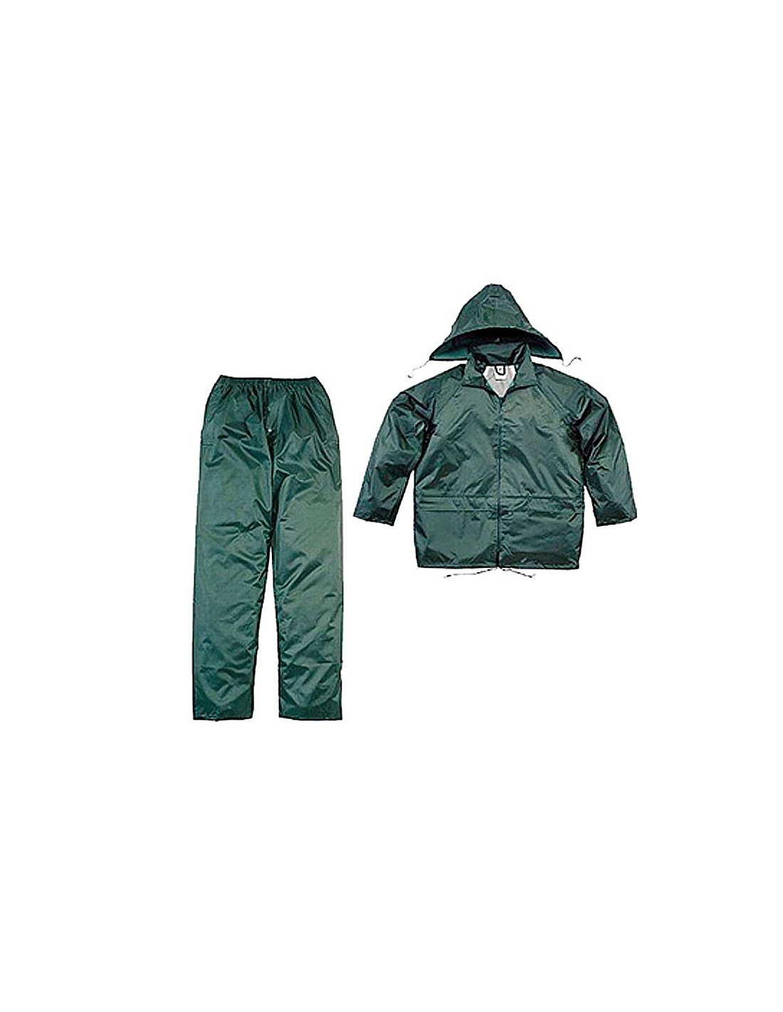 Conjunto de lluvia fabricado en poliéster impregnado de PVC. Formado por chaqueta y pantalón. Con costuras termoselladas. La chaqueta tiene capucha fija, cierre por cremallera antifrío, mangas raglán, puños ajustables con corchetes y 2 bolsillos. El pantalón tiene cintura elástica, bajo de piernas ajustado con corchetes y 2 pasamanos. HOMOLOGADO EN NORMA EN343:31X Y EN ISO 13688.