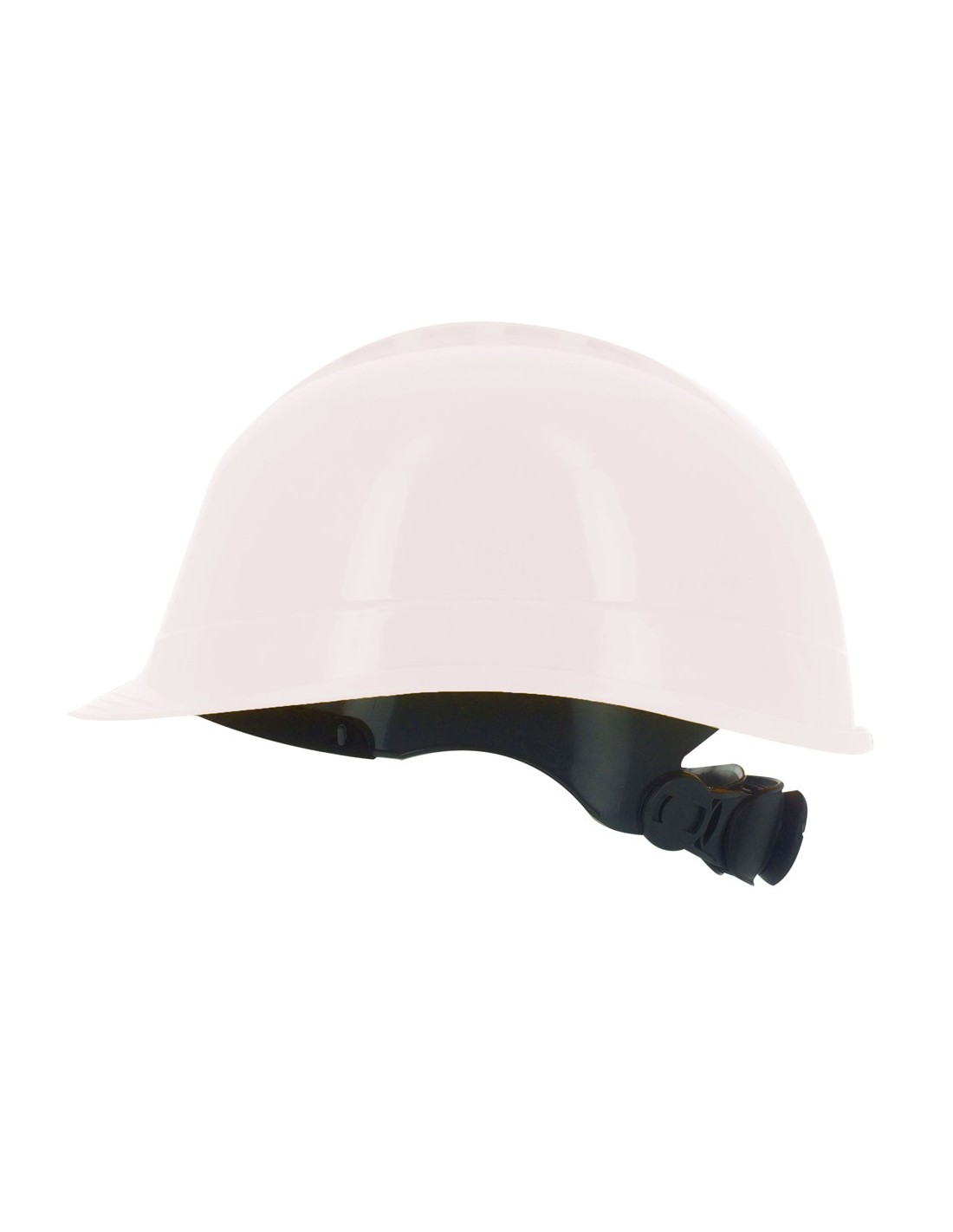 Casco de polietileno con ruleta y atalaje de 6 puntos plástico. Modelo ventilado con ranura universal. Canal recogeaguas, 8 orificios de ventilación que reducen la temperatura interna y mantienen la ventilación. Cuerpo principal de HDPE, ranuras para orejeras, arnés de suspensión PE de 6 puntos, banda de sudoración transpirable, absorbente y que reduce el impacto.