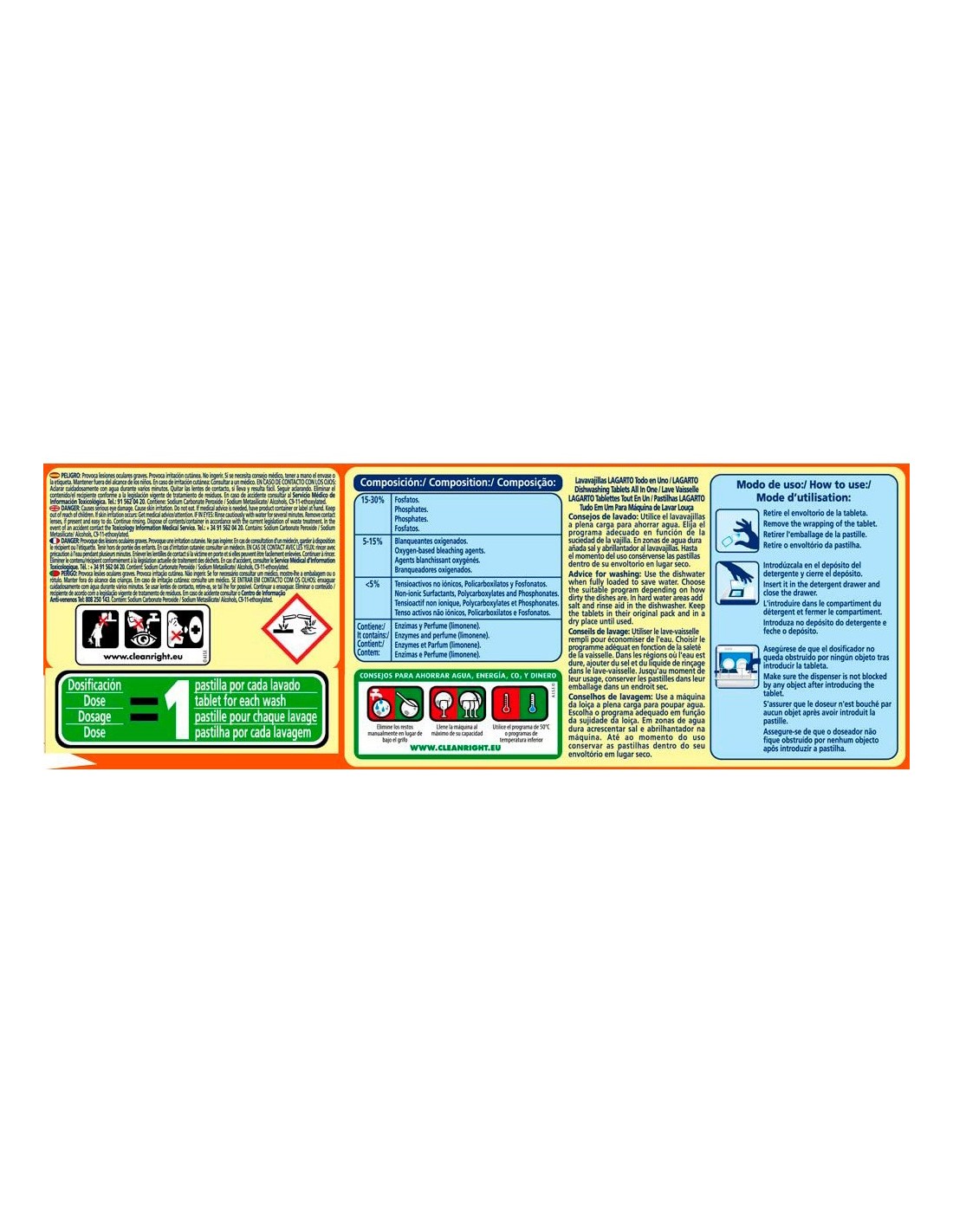 Pastillas para el lavado de la vajilla en lavavajillas. Eficaz en todo tipo de aguas y temperaturas. Con gran poder desincrustante de grasa y residuos de comida. Detergente lavavajillas clásico, eficaz contra todo tipo de suciedad.