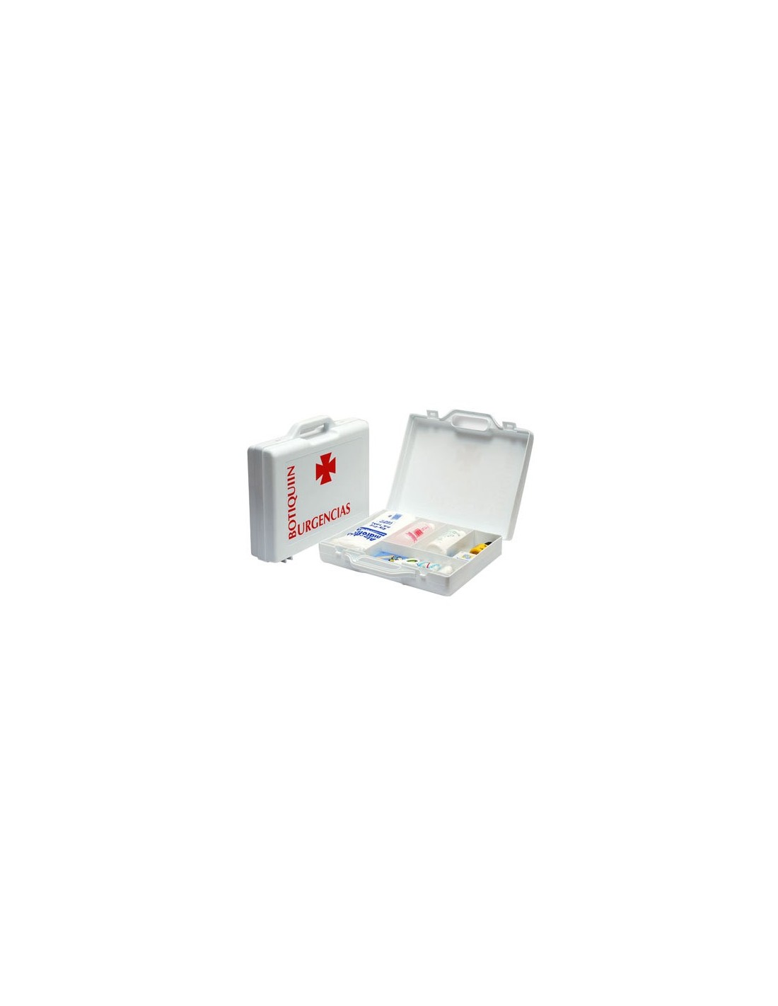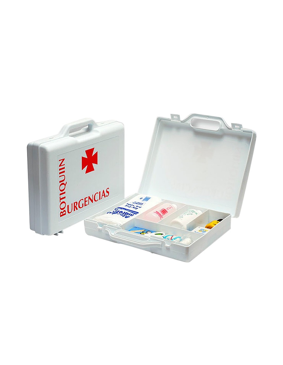 Maletín fabricado en polipropileno copolímero para mayor elasticidad y resistencia. La tapa encaja en todo su perímetro sobre un zócalo alrededor del cuerpo, con dos ejes circulares giratorios en la puerta posterior, que permite la apertura total. Incluye el material previsto para los primeros auxilios: agua oxigenada, alcohol, algodón, esparadrapo, guantes, pinzas, gasas, tijeras, tiritas y vendas. Medidas: 270 x 230 x 70 mm.