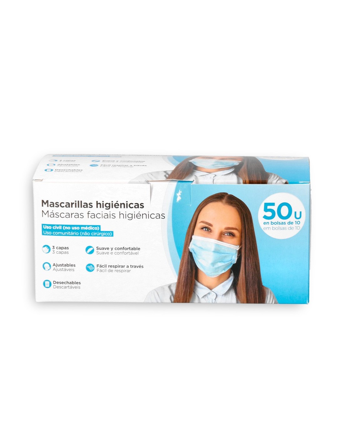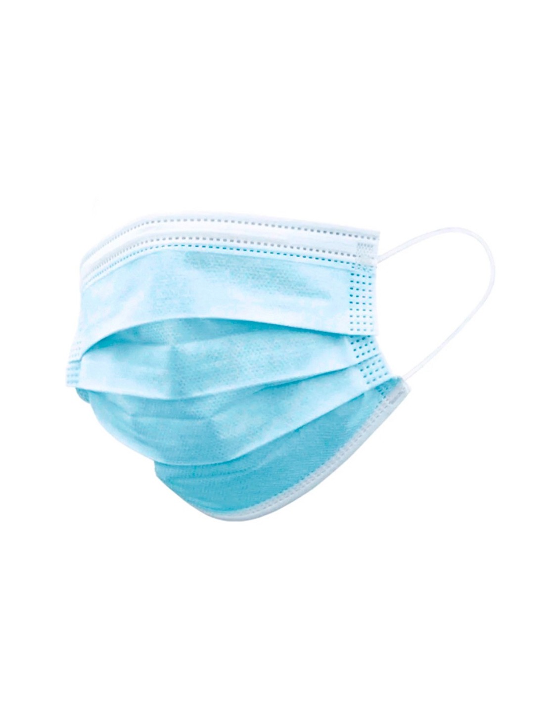 Mascarilla higiénica azul desechable de 3 capas no reutilizable. Acabado termosellado, con elásticos de fijación y pinza adaptable en nariz para un firme ajuste. No uso médico. Proporciona una buena permeabilidad al aire. Aretes altamente elásticos. 3 capas. Exterior 1: Non-Woven (polipropileno), capa media: Meltblown (90% polipropileno, 10% viscosa), exterior 2: Non-Woven (polipropileno). Medidas: 180 x 100 mm. HOMOLOGADO EN NORMA EN14683: TIPO II.