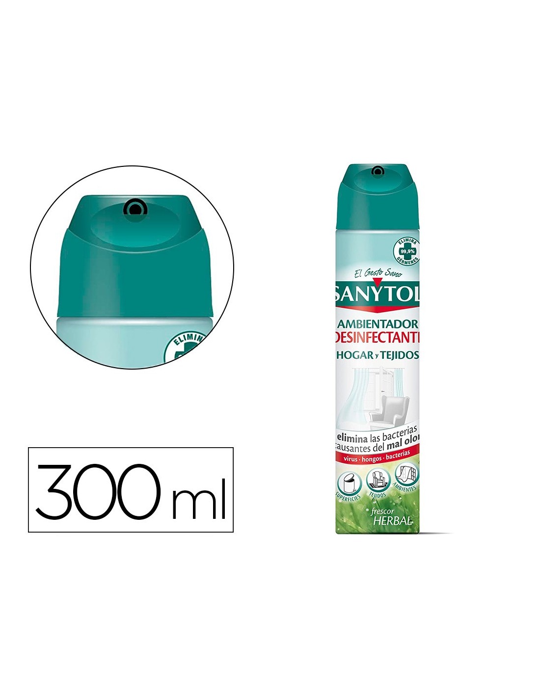 Aerosol desodorizante y desinfectante de textiles y superficies que asegura una higiene perfecta. Elimina los malos olores de raíz. Perfume agradable. Su triple acción desinfecta entre otros: bacterias (pseudomonas aeruginosa, staphylococcus aureus, escherichia coli, enterococcus Hirae), hongos (trichophyton - pie de atleta, candida albicans y aspergilus niger), virus (Influenza virus A H1N1- virus de la gripe, Adenovirus Type 5, Poliovirus Type 1 y coronavirus humano 229E). Apto para superficies, cubo de basura, desagües, pomos, alfombras, cortinas, sofás, cojines, bolsas de deporte, camas de mascotas. Para el interior del coche, interior armarios, zonas con olor a cerrado o a humedad.