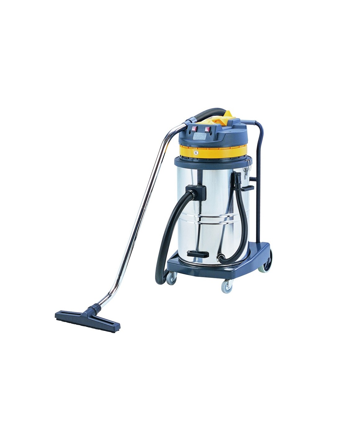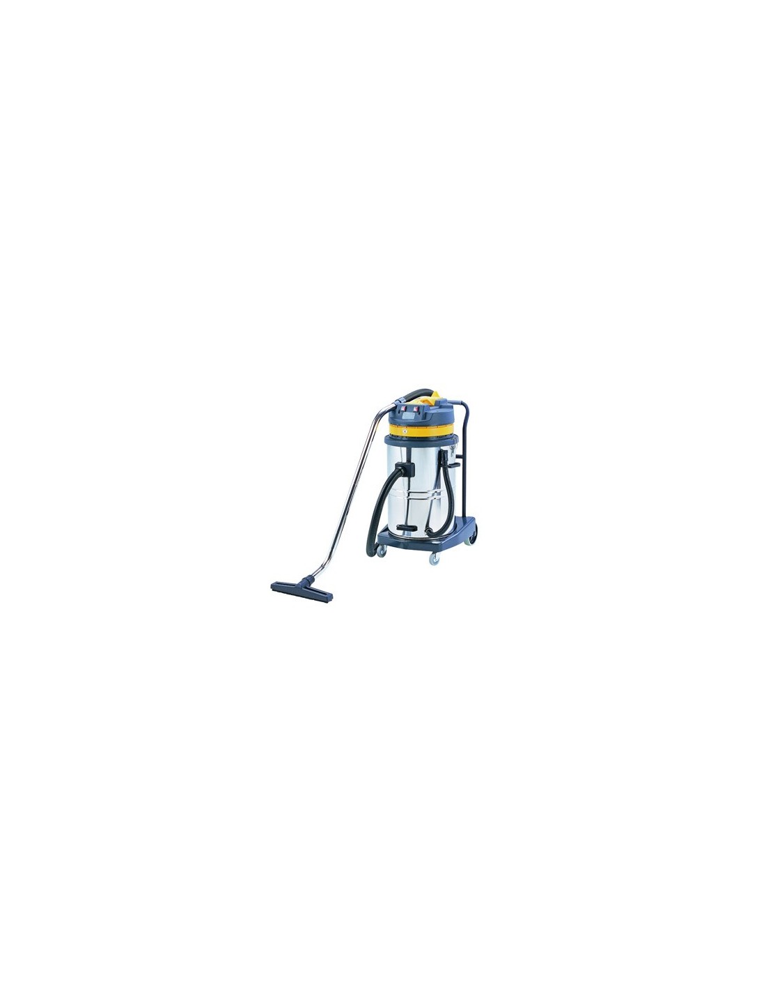 Aspiradora industrial para limpieza en seco y con agua. Totalmente higiénico, ideal para alérgicos. Con plataforma con ruedas incorporadas para un transporte más cómodo y fácil. Capacidad 70 litros. Potencia: 2000W. Medidas: 60 x 102,5 x 54 cm. Peso: 9,5 kg.