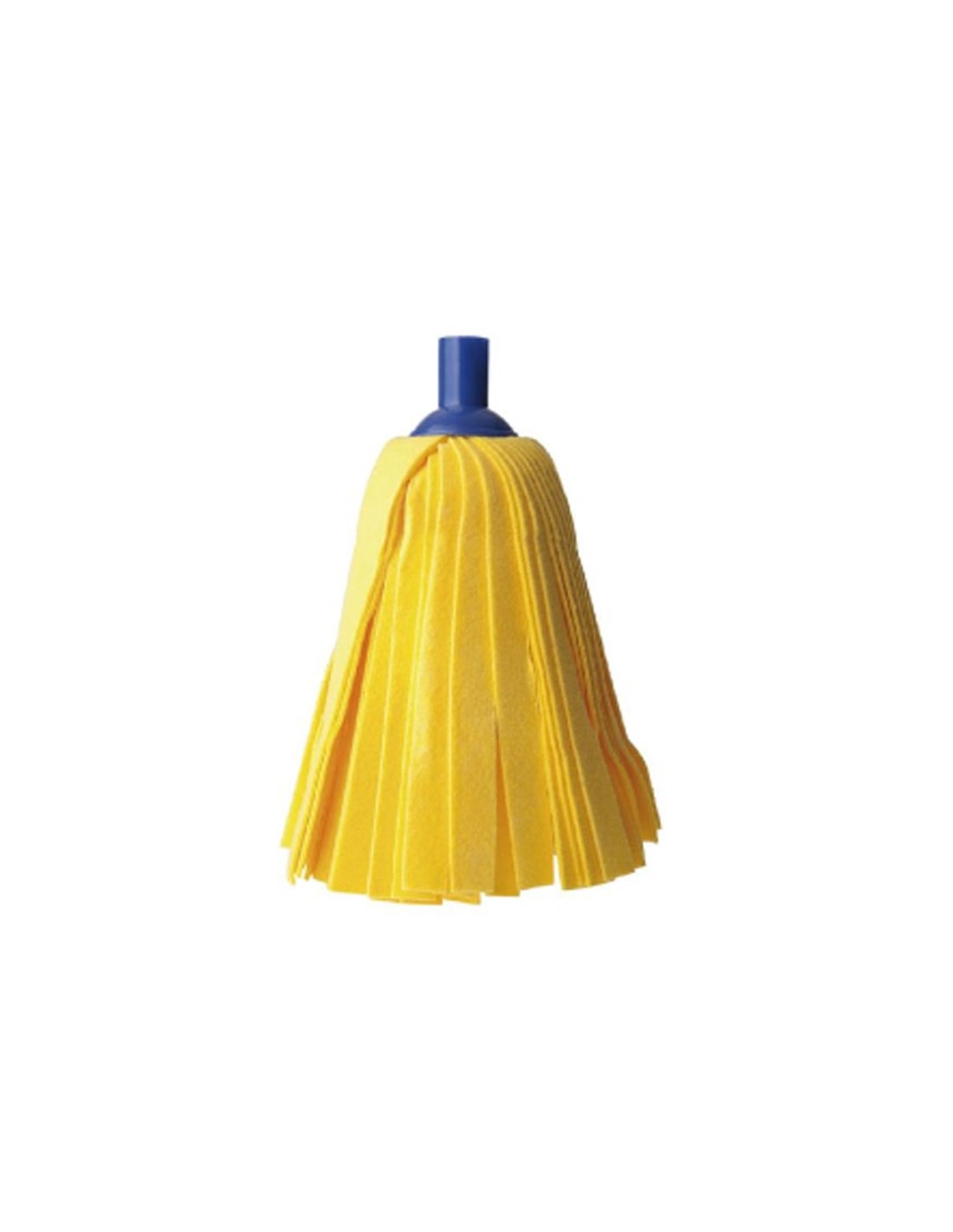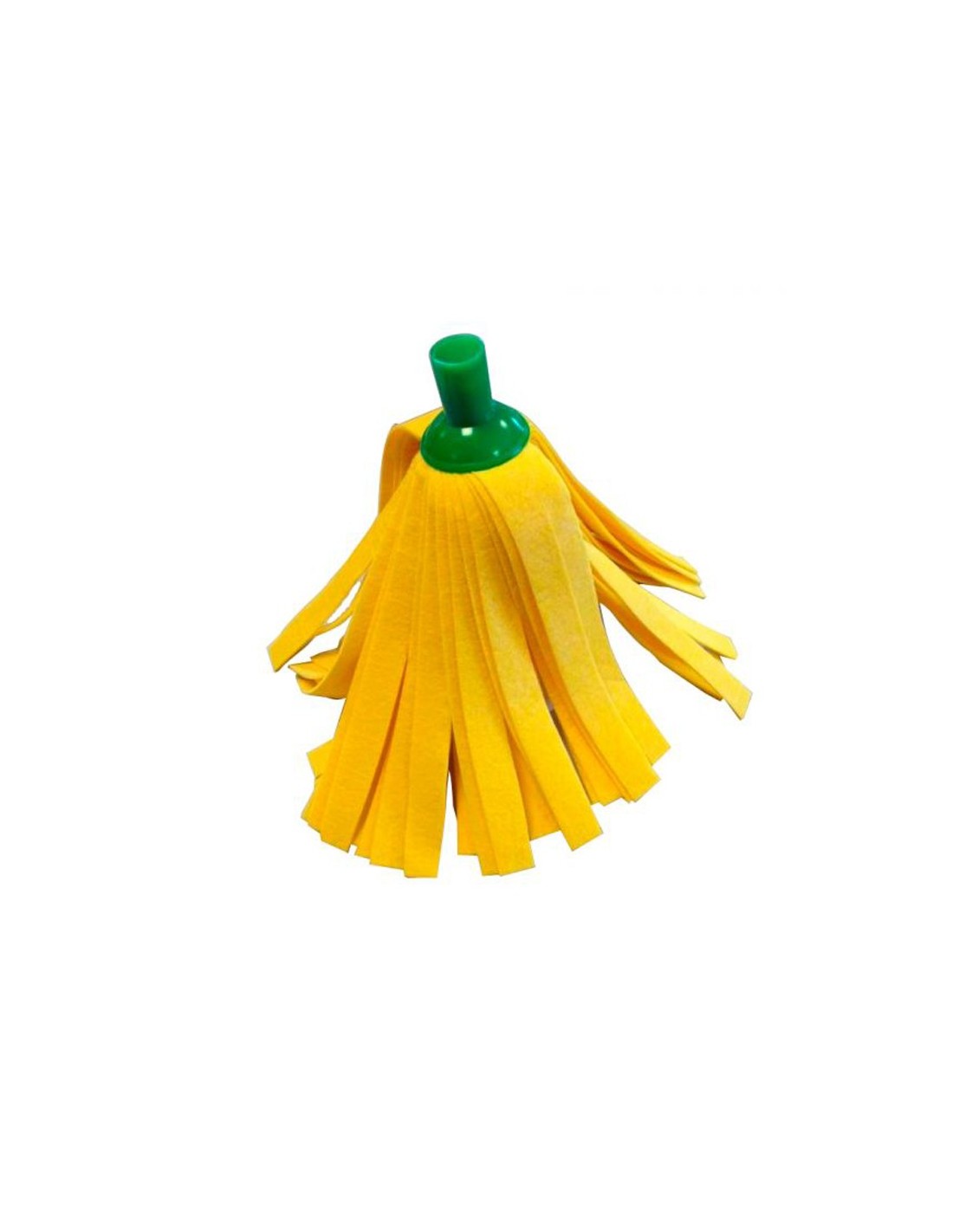 Fregona tiras amarillas compuesta 60% Viscosa, 20% Poliéster, 20% Polipropileno, Soporte de plástico polietileno color verde con peso de 20 gramos. Medidas tiras: 50x2 cm. Número de tiras por fregona: 40. Color amarillo. Peso: 105 gramos.