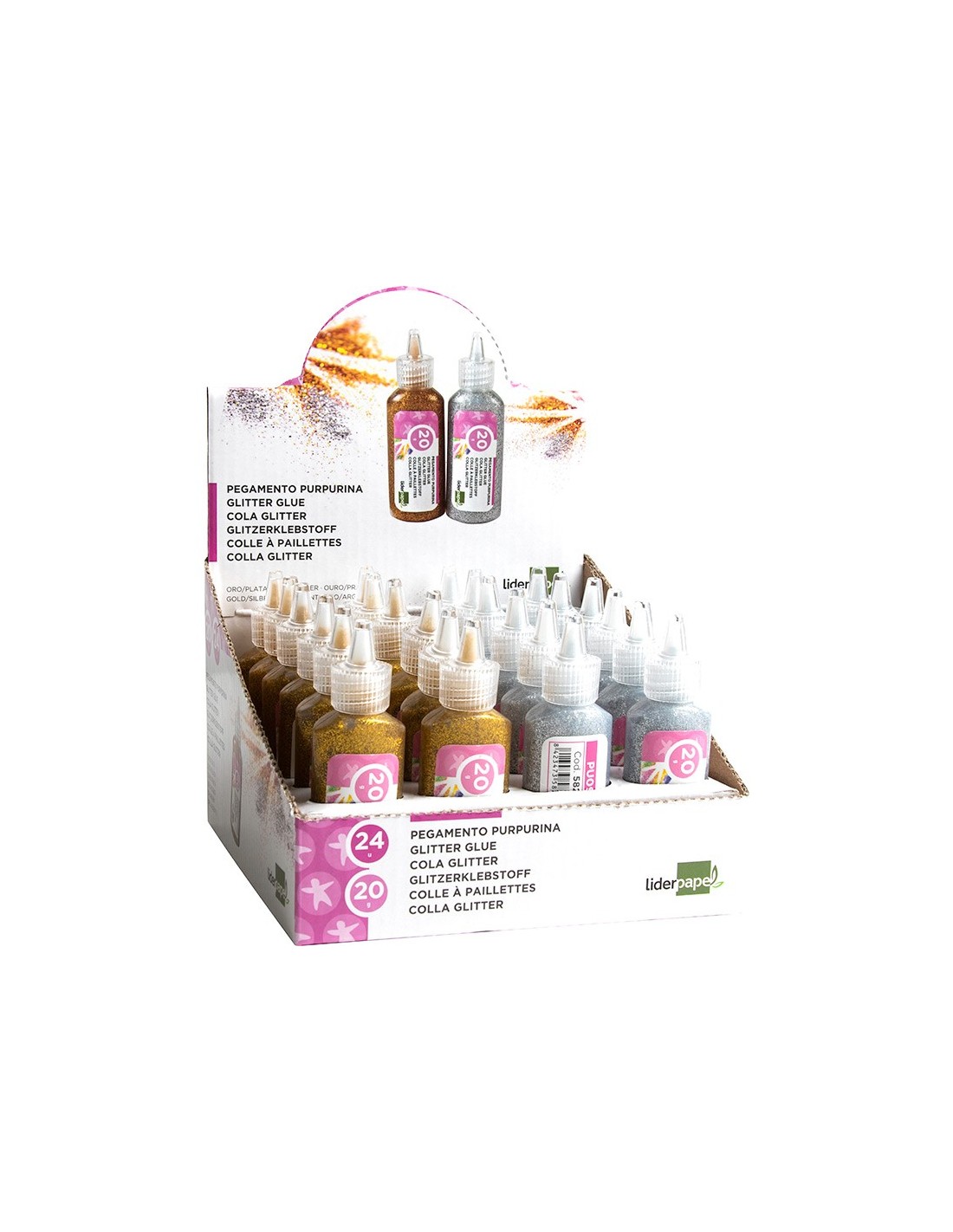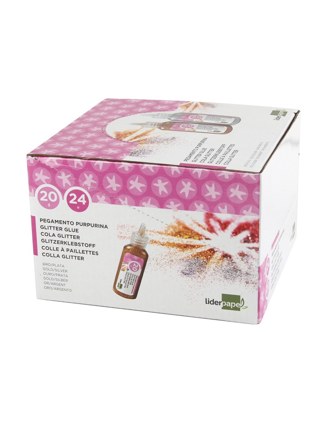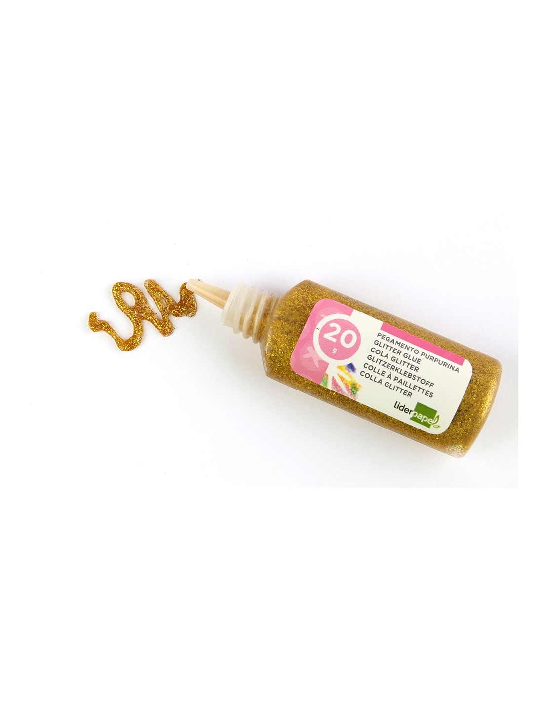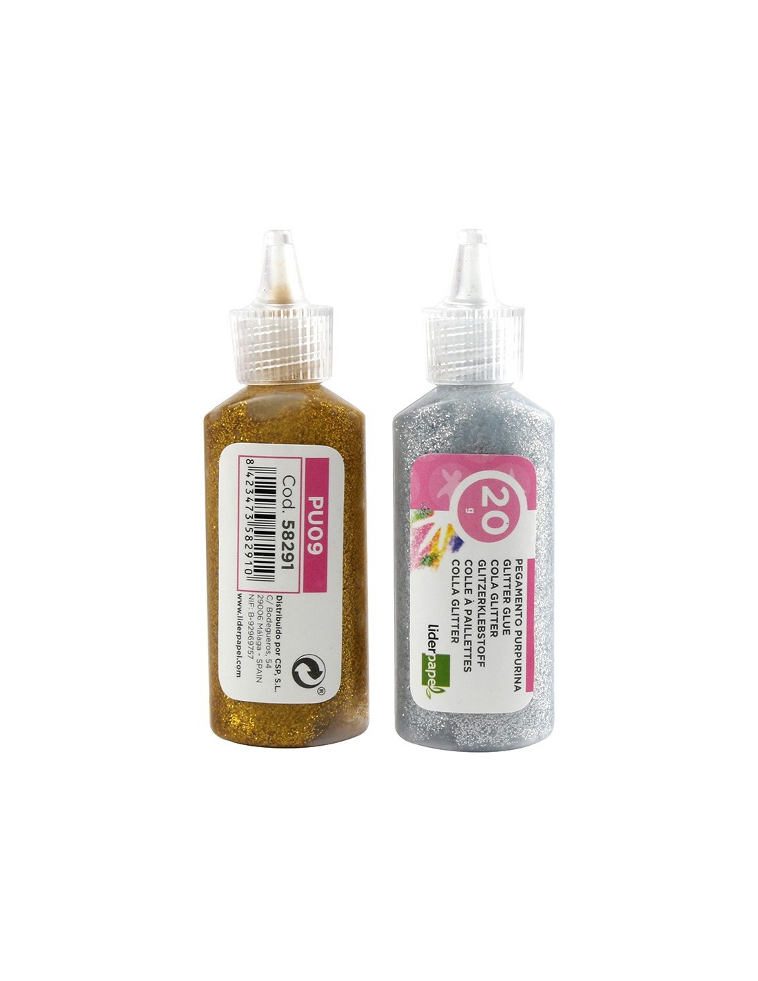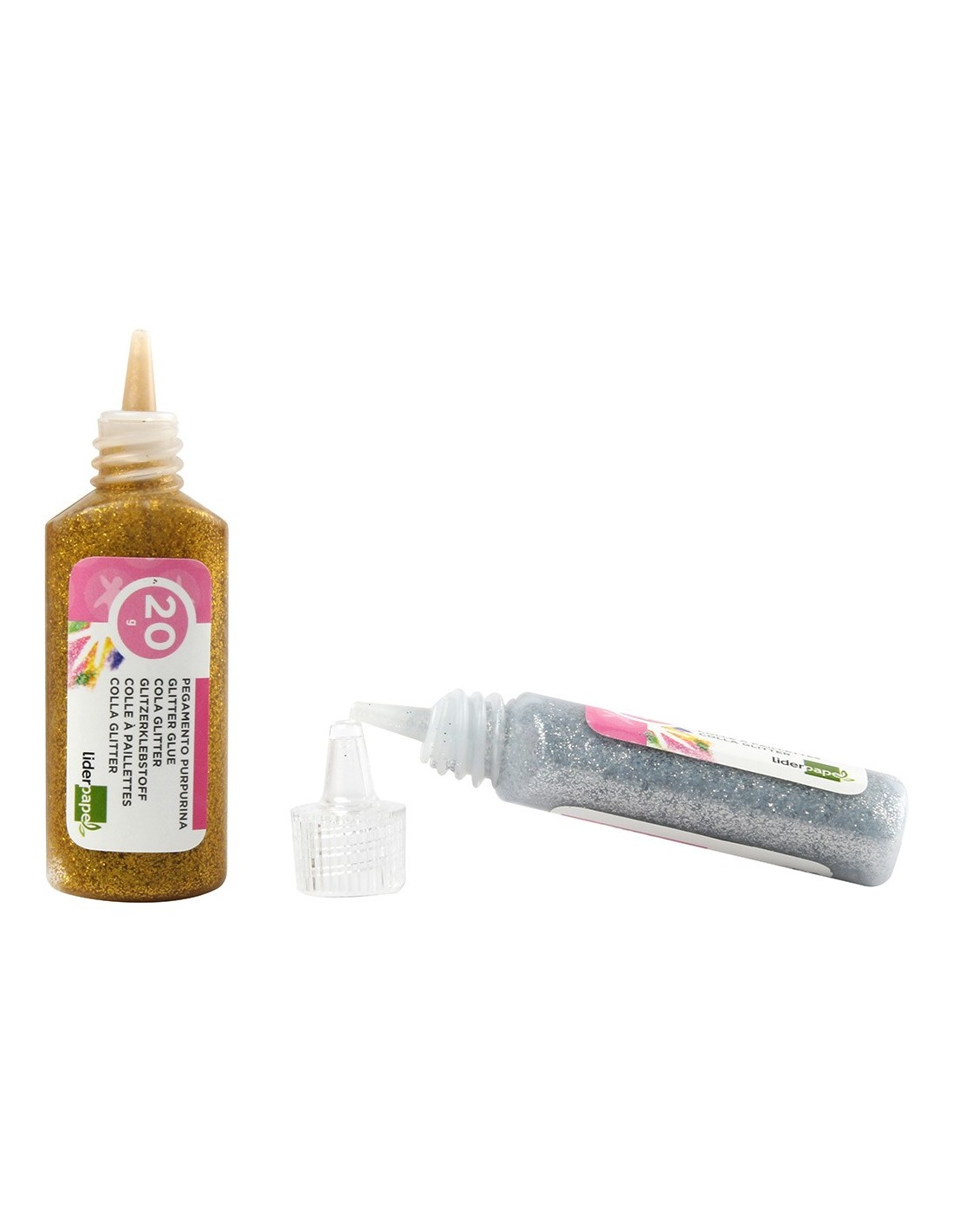 Pegamento con purpurinas metalizadas. Diferentes colores. Ideal para trabajos manuales. Con dosificador. Recomendado a partir de los 3 años de edad. El bote de 20 g.