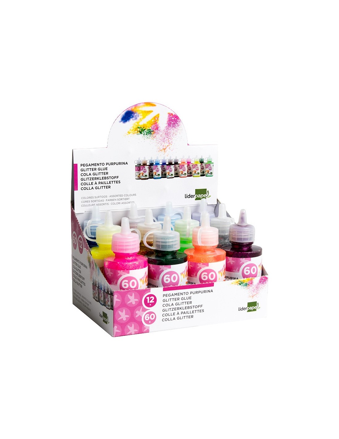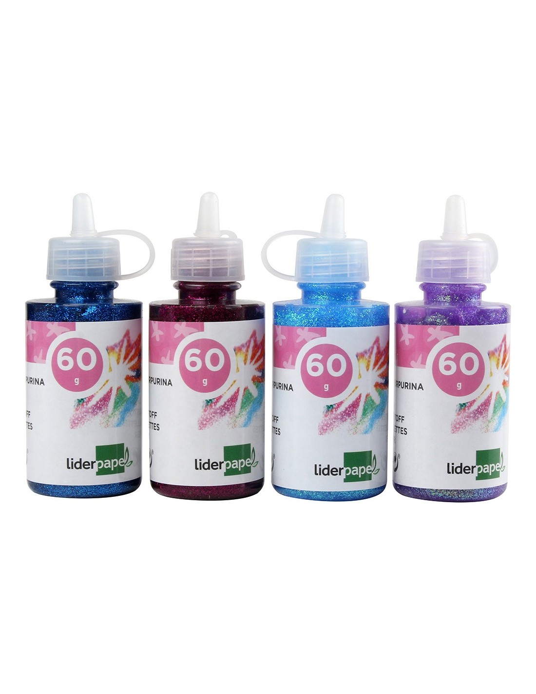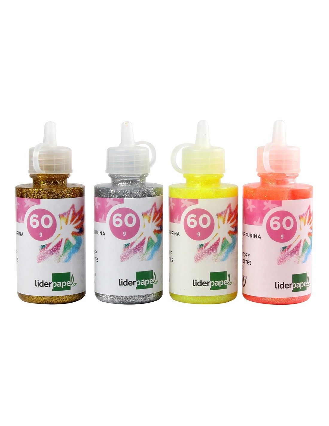 Pegamento con purpurinas metalizadas. Colores surtidos. Ideal para trabajos manuales. Con dosificador. Recomendado a partir de los 3 años de edad. El bote de 60 g.