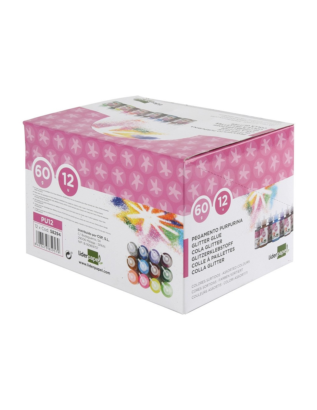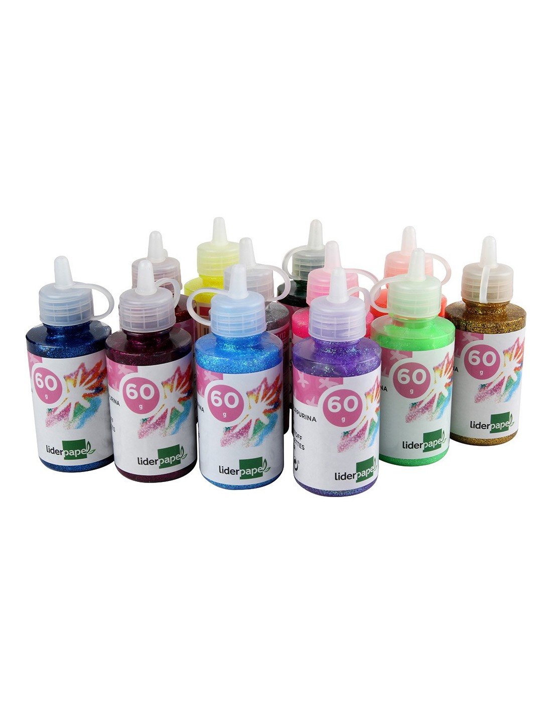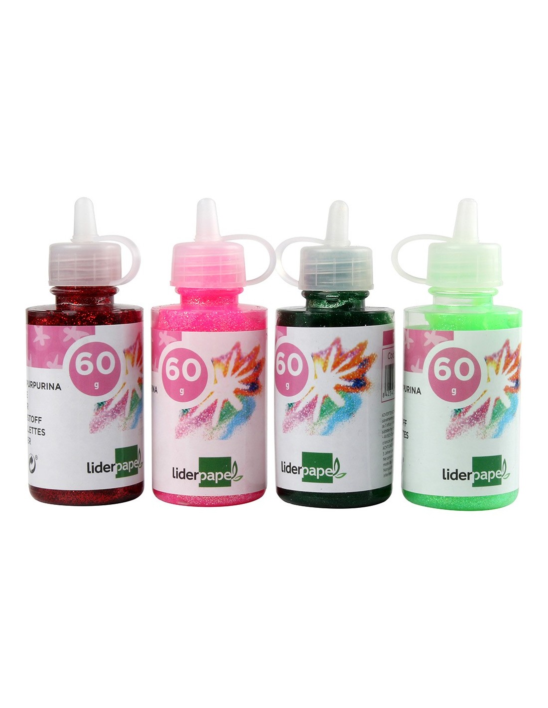 Pegamento con purpurinas metalizadas. Colores surtidos. Ideal para trabajos manuales. Con dosificador. Recomendado a partir de los 3 años de edad. El bote de 60 g.