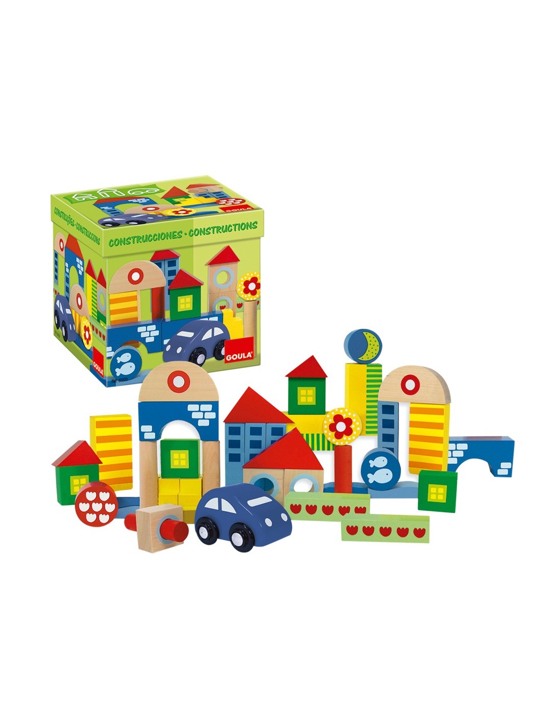 Juego de 41 piezas de arquitectura de madera serigrafiadas por las dos caras. Incluye un coche con ruedas. Formas originales y colores muy vivos. Incluye envase de cartón para guardar las piezas. A partir de 1 año. 1 o más jugadores. Medidas: 19 x 18,5 x 18,5 cm.