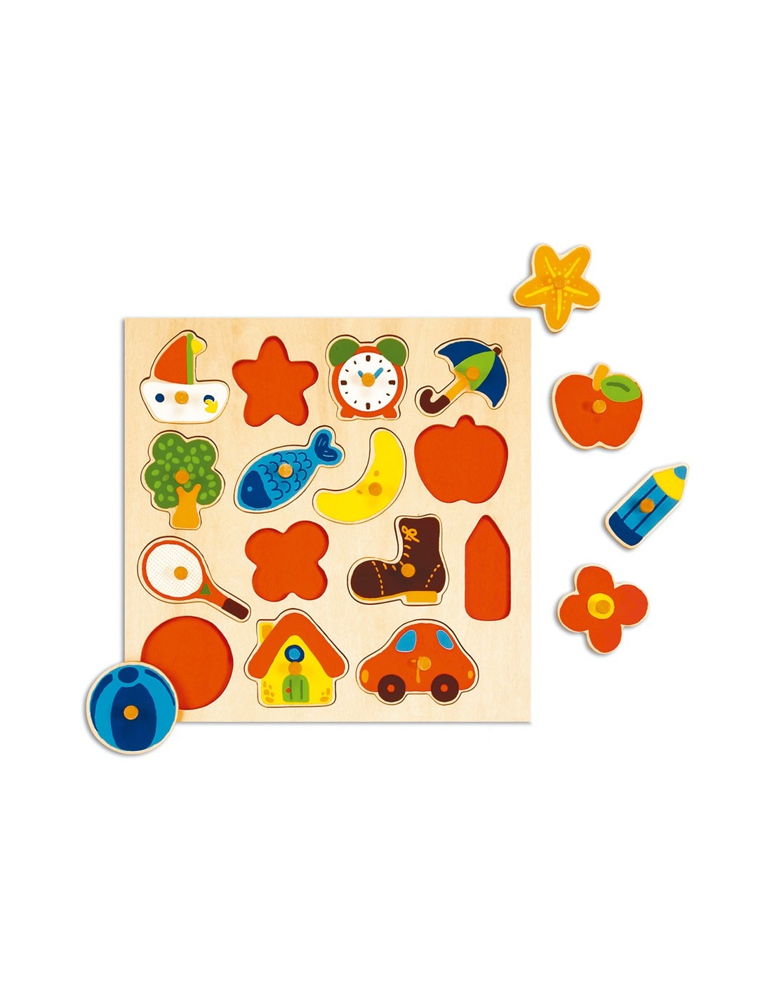 ENCAJE DE 15 PIEZAS. ILUSTRACIONES DE COLORES VISTOSOS. FONDO DE UN SOLO COLOR. COLOCA LAS PIEZAS AYUDADA DE LA SILUETA. A PARTIR DE 1 AÑO. 1 O MAS JUGADORES. MEDIDAS: 28 X 28 X 2,5 CM.