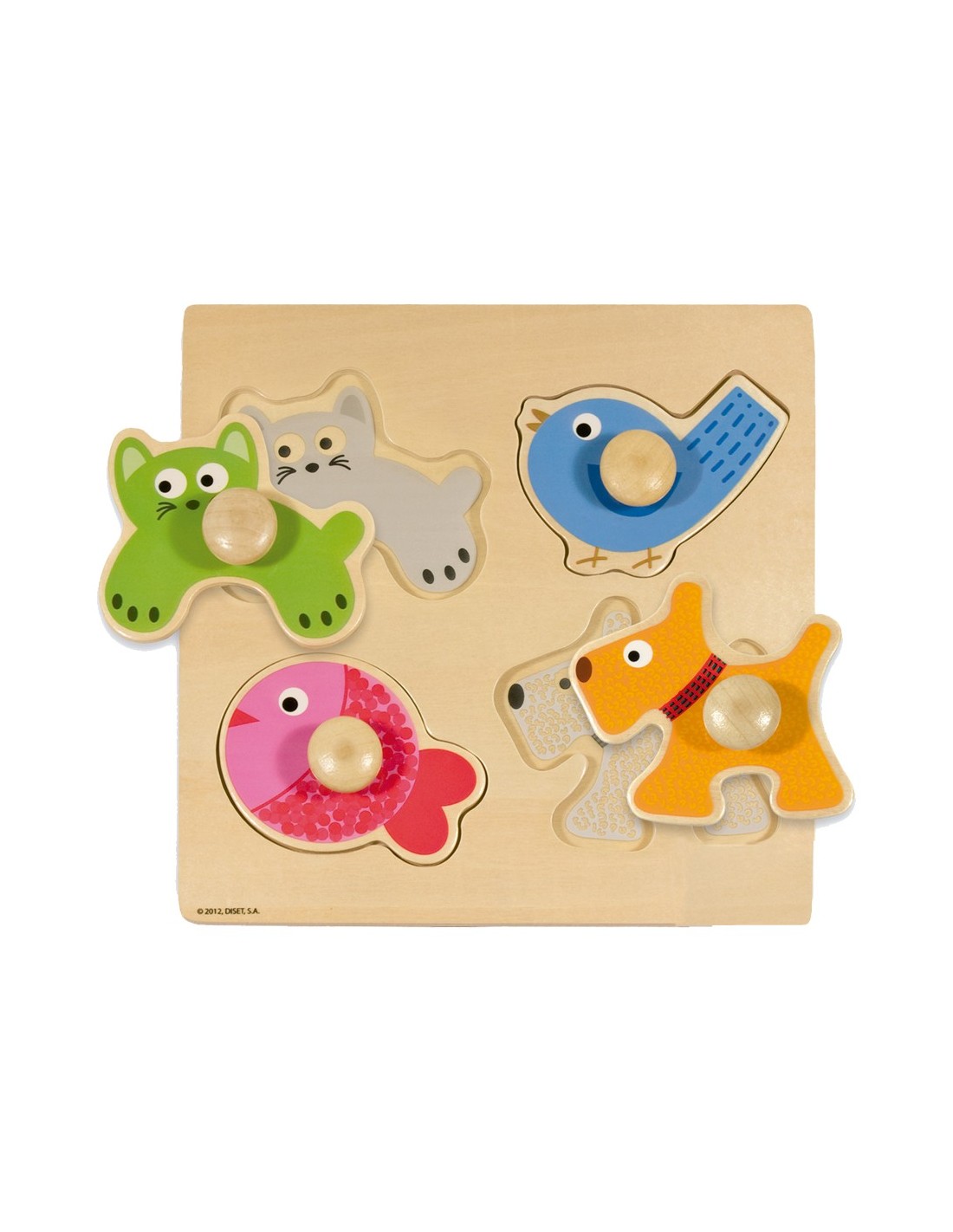 Primer puzle de cuatro piezas de madera para los más pequeños. Aprende cuatro animalitos domésticos, como son el gato, el perro, un pajarito y un pez. Asocia la pieza con su silueta. Desarrolla la coordinación ojo/mano. Destreza manual. Aprendizaje de diferentes colores. A partir de 1 año. Medidas: 22 x 22 x 4 cm.