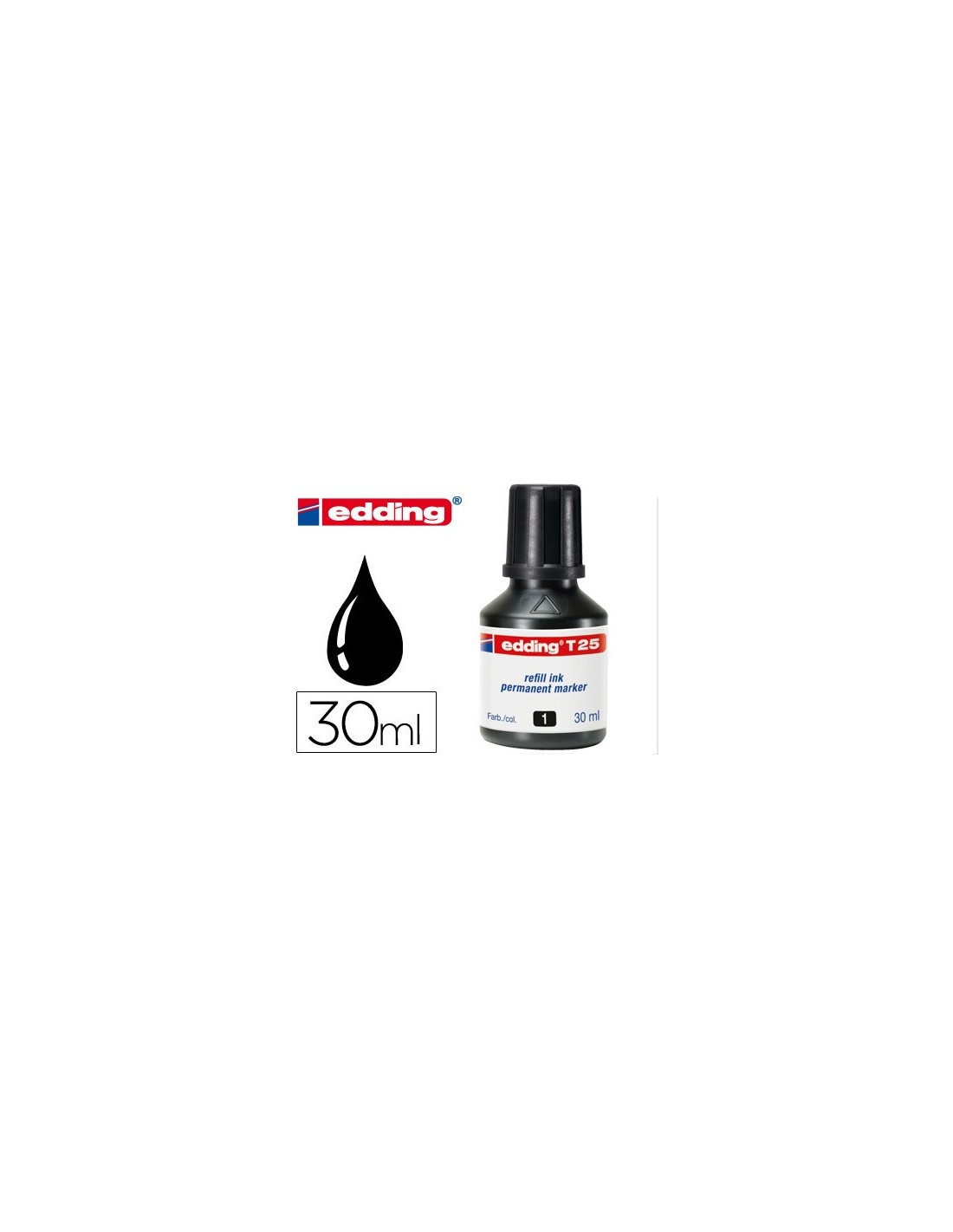 Tinta permanente casi sin olor, en bote con cánula. Para los marcadores rellenables Edding. Se puede aplicar directamente sobre tampones, plantillas, etc. El frasco de 30 ml.