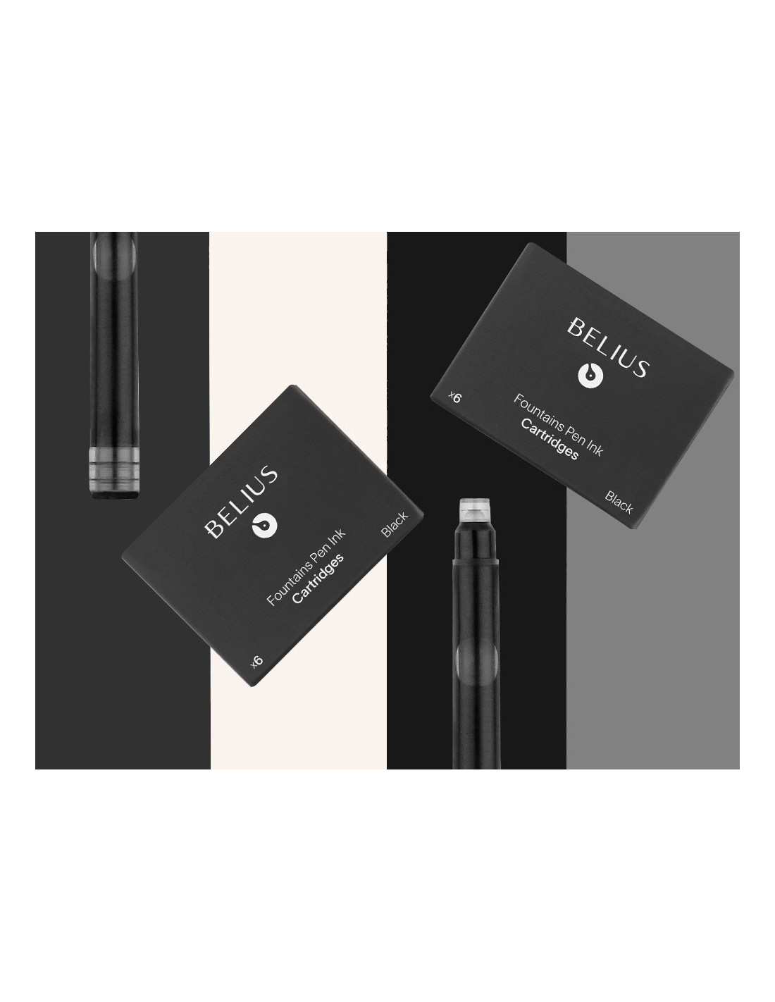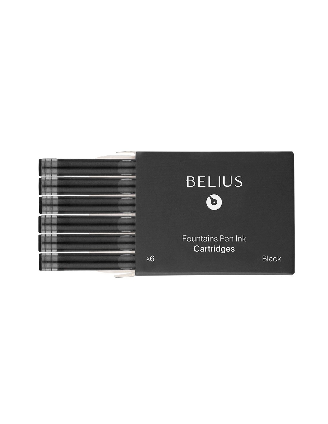 Cartuchos de tinta para plumas Belius. Color negro. Caja de 6 unidades. Tinta de calidad Made in Germany. Formato estándar y de uso universal. Diámetro de la apertura de 2,6 mm. Made in Germany. Tinta de calidad elaborada en Alemania.