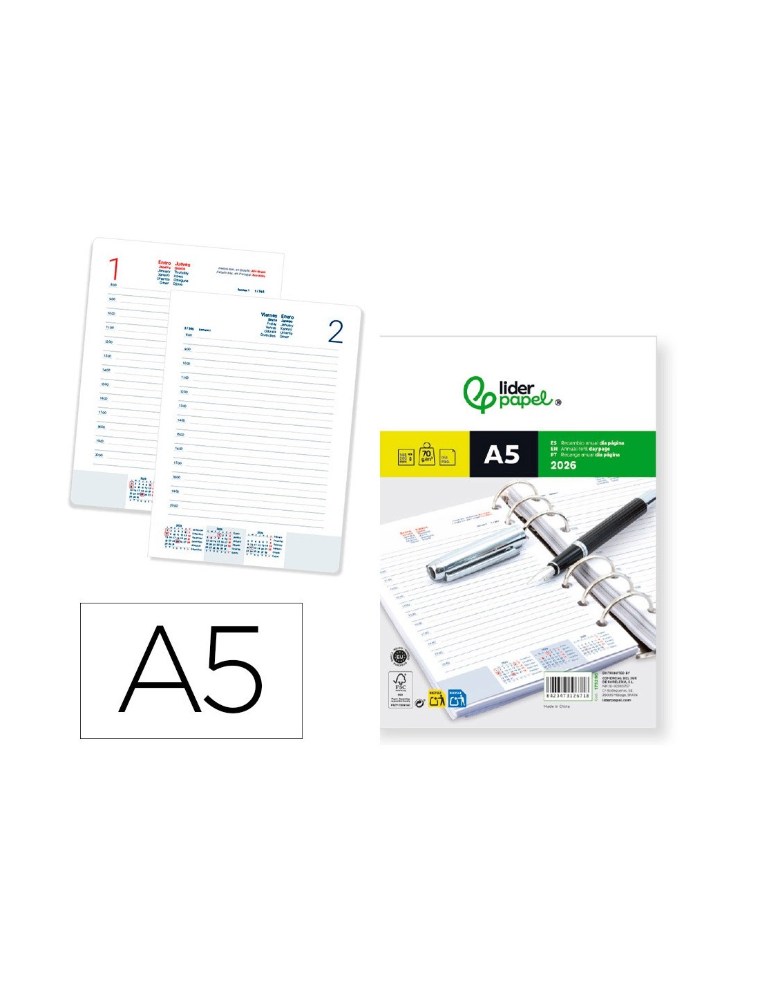 Si tienes una agenda de anillas, o has decidido empezar a utilizarlas, te presentamos el Recambio Anual 2026 de 6 anillas, con formato DIA PAGINA. Perfecto para planificar tus días. Combínalo con las COLECCION es Tarento o Nero. ¡Tú eliges! El interior incluye: Calendario trienio, Planning Anual, Santoral, Feriados de España y Portugal, Distancias kilométricas entre ciudades europeas, Mapas de usos horarios, Contactos. Sabado y Domingo en diferente página. CARACTERISTICAS: AGENDA ENCUADERNADA LIDERPAPEL AÑO 2026, DIA PAGINA, A5, PAPEL 70G FSC, COLECCION RECAMBIO