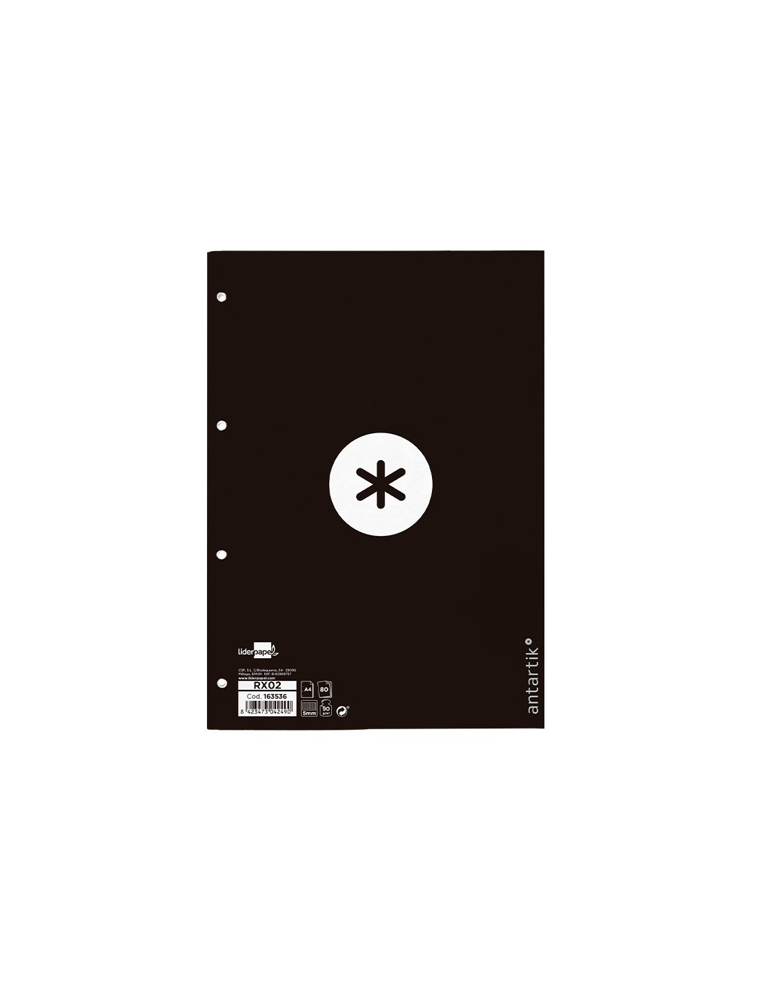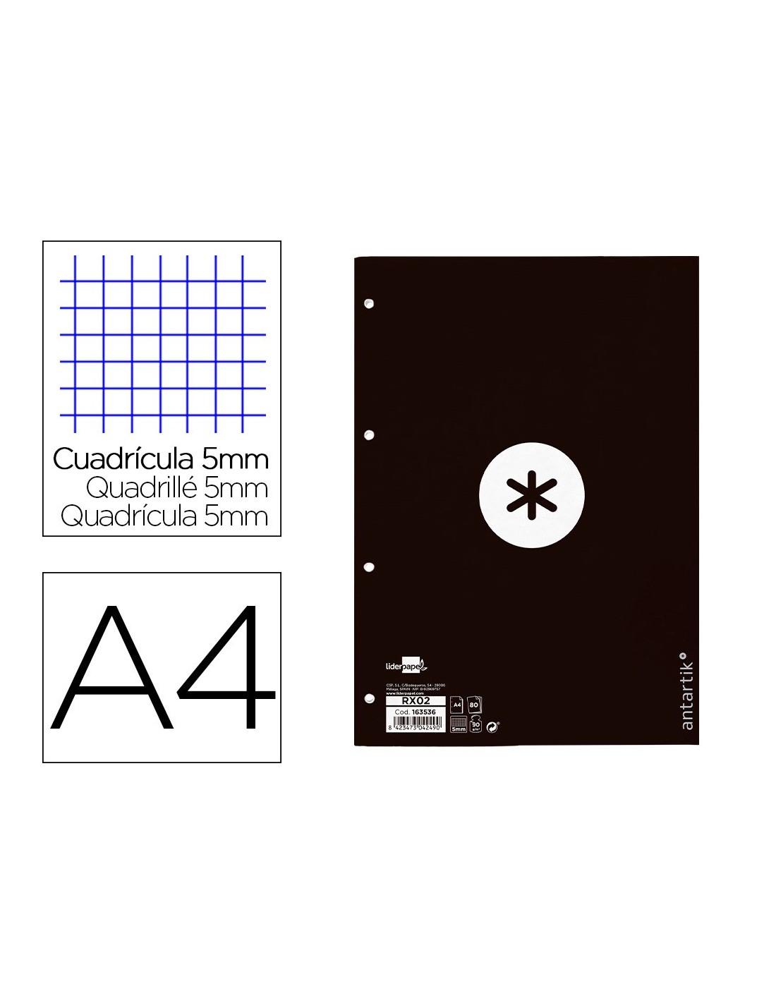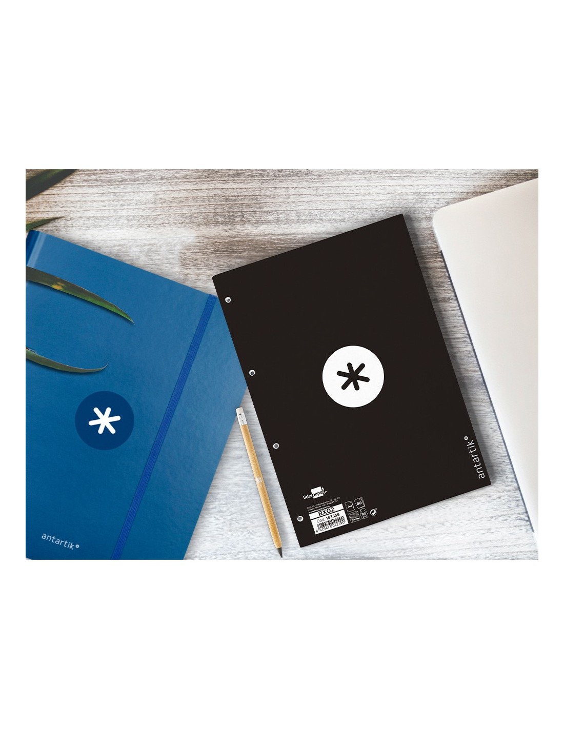 Recambio DIN A4 Antartik 80 hojas. Cuadro de 5 mm. 1 banda con 4 taladros. El recambio con exclusivo diseño, características de alta gama, un recambio sin precedentes que se distingue por la suavidad y blancura de su papel. Papel extrablanco de 90 g/m² ultrasuave que hace la escritura mucho más fluida. La tinta no traspasa.