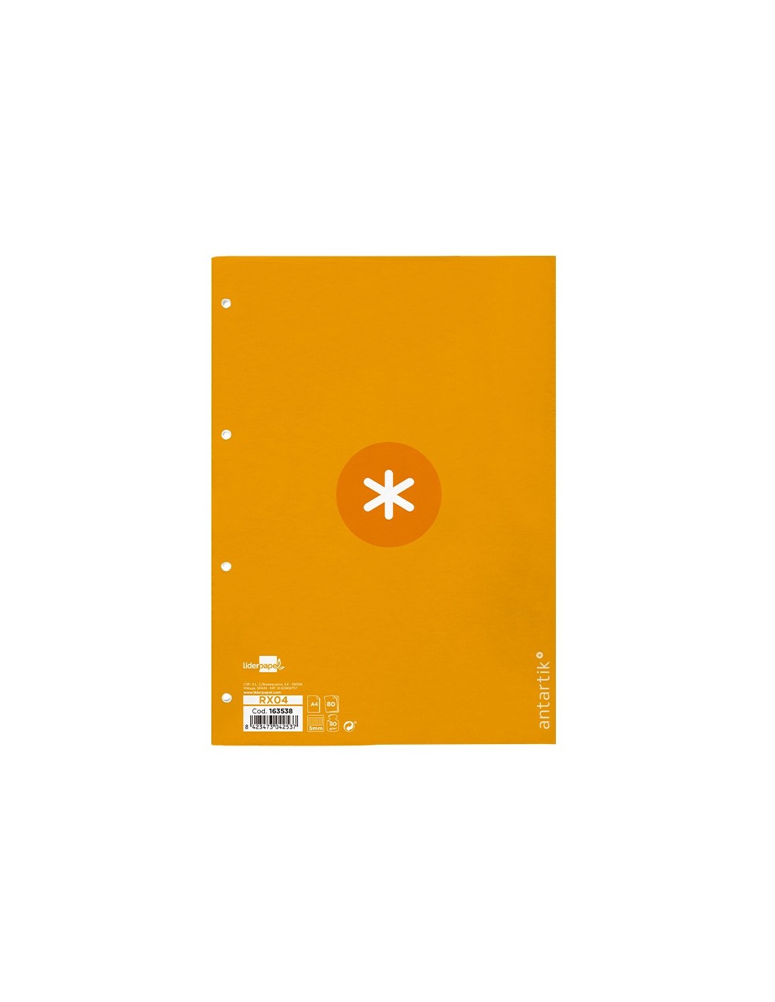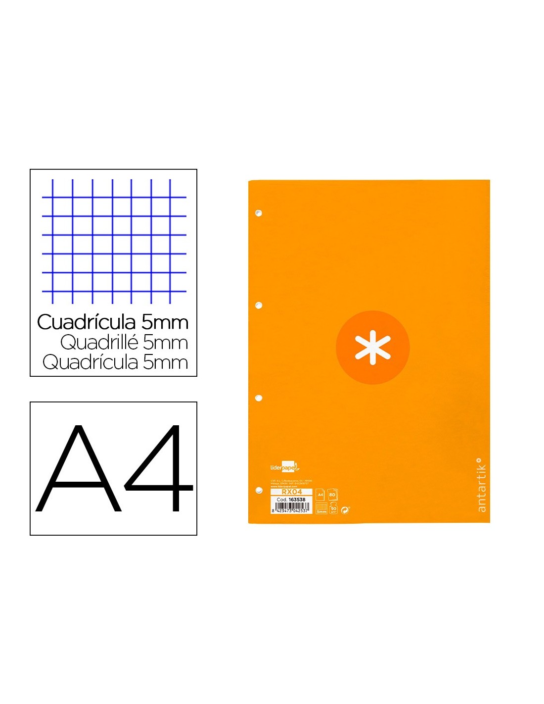 Recambio DIN A4 Antartik 80 hojas. Cuadro de 5 mm. 1 banda con 4 taladros. El recambio con exclusivo diseño, características de alta gama, un recambio sin precedentes que se distingue por la suavidad y blancura de su papel. Papel extrablanco de 90 g/m² ultrasuave que hace la escritura mucho más fluida. La tinta no traspasa.