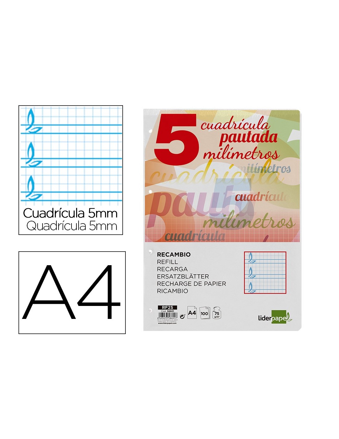 100 hojas. 75 g/m2. Con margen. Con cuadrícula pautada que sirve de guía al alumno en el aprendizaje de la escritura.