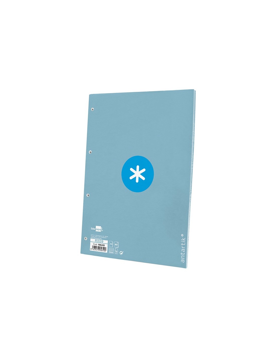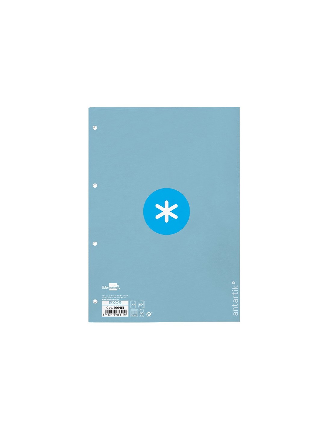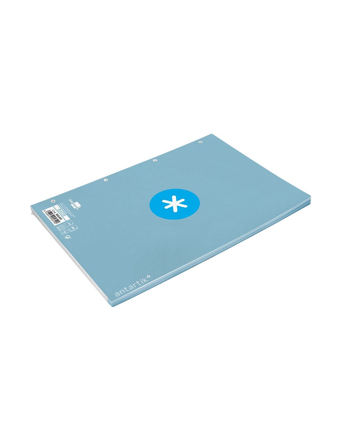 Recambio A4 Antartik. 80 hojas. Cuadro de 5 mm. 1 banda con 4 taladros. Elrecambio con exclusivo diseño, características de alta gama, un recambio sin precedentes que se distingue por la suavidad y blancura de su papel. Papel extrablanco de 90 g/m2, ultrasuave que hace la escritura mucho más fluida. La tinta no traspasa. Color celeste. Ideal como complemento para tu carpeta Antartik. Color celeste.