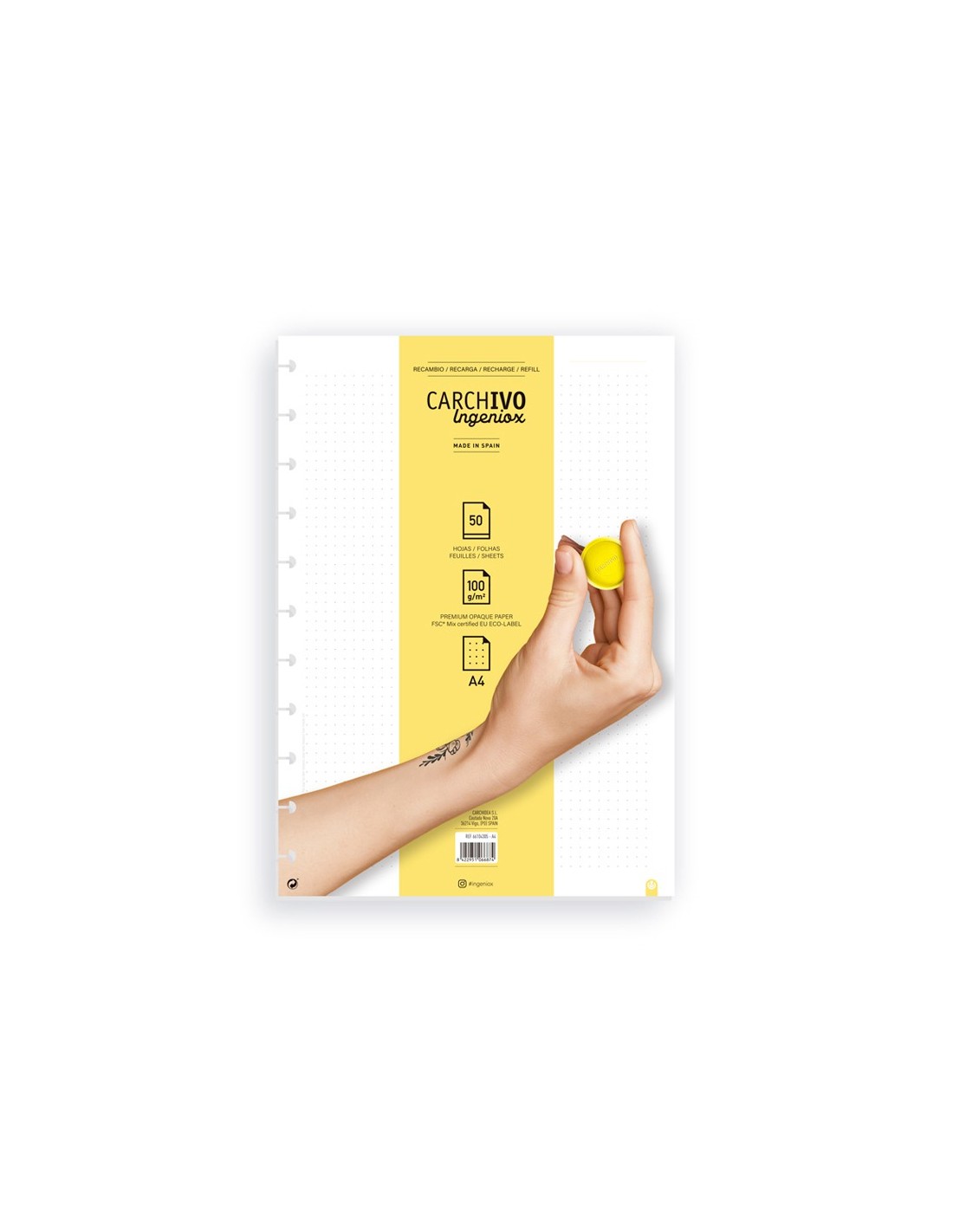 Recambio de papel Carchivo Ingeniox: tu cuaderno sostenible y 100% personalizable. Diseñado para el sistema de encuadernación de discos, te permite personalizar, organizar y reorganizar tus notas, apuntes y planes de manera rápida y sencilla en tu cuaderno Carchivo Ingeniox. Características: Papel: 50 hojas extraíbles de 100 gramos. Papel Premium Opaque certificado FSC Mix EU ECO-LABEL. Formato: Din A4. Papel: dots. Diseño y fabricación: Carchivo, España. Reciclable: 100%. Una calidad inmejorable para el cuaderno de discos adorado por estudiantes, opositores. Es ideal para cualquier tarea, ya sea en tus estudios, la oficina, en tus proyectos personales o creativos. Accesorios compatibles: recambios de papel (Dots, rayas, liso, cuadrícula, my Planner), separadores, marcapáginas, perforadora. Versatilidad y sostenibilidad se unen para el Cuaderno Carchivo Ingeniox: personaliza tu experiencia de organización según tus necesidades y preferencias. Aprovecha la flexibilidad del sistema de di