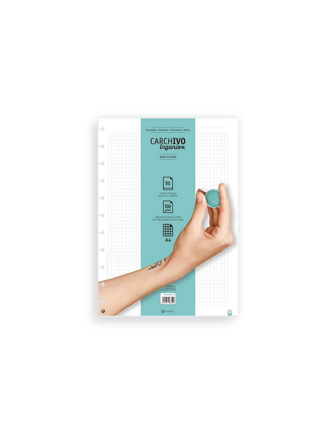 Recambio de papel Carchivo Ingeniox: tu cuaderno sostenible y 100% personalizable. Diseñado para el sistema de encuadernación de discos, te permite personalizar, organizar y reorganizar tus notas, apuntes y planes de manera rápida y sencilla en tu cuaderno Carchivo Ingeniox. Características: Papel: 50 hojas extraíbles de 100 gramos. Papel Premium Opaque certificado FSC Mix EU ECO-LABEL. Formato: Din A4. Papel: cuadrícula. Diseño y fabricación: Carchivo, España. Reciclable: 100%. Una calidad inmejorable para el cuaderno de discos adorado por estudiantes, opositores. Es ideal para cualquier tarea, ya sea en tus estudios, la oficina, en tus proyectos personales o creativos. Accesorios compatibles: recambios de papel (Dots, rayas, liso, cuadrícula, my Planner), separadores, marcapáginas, perforadora. Versatilidad y sostenibilidad se unen para el Cuaderno Carchivo Ingeniox: personaliza tu experiencia de organización según tus necesidades y preferencias. Aprovecha la flexibilidad del sistema
