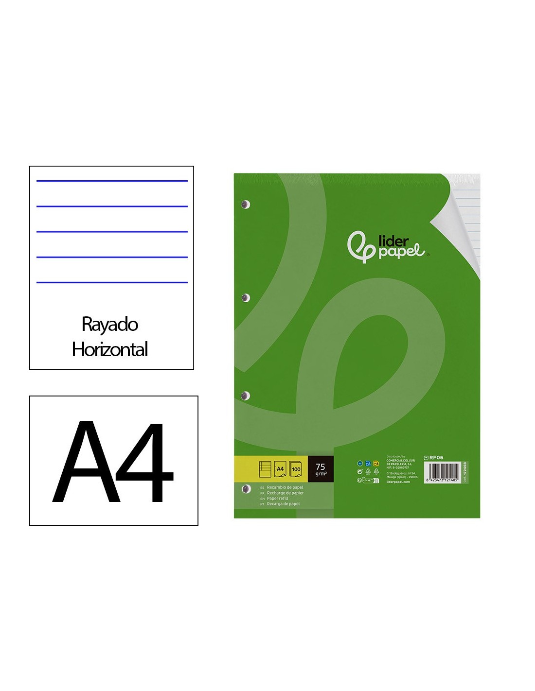 El recambio Liderpapel Din A4 retractilado de 100 hojas sueltas es una opción de gran calidad y funcionalidad, ideal para estudiantes, profesionalesy cualquier persona que requiera un soporte confiable para sus apuntes y documentos. Fabricado con papel de 75 gr de alta calidad, cuenta con márgenes que proporcionan un espacio adicional para anotaciones. Su diseño con4 taladros lo hace compatible con archivadores y carpetas estándar, permi tiendo una organización sencilla y práctica. Perfecto para quienes buscan eficiencia y calidad en su material de oficina o estudio.